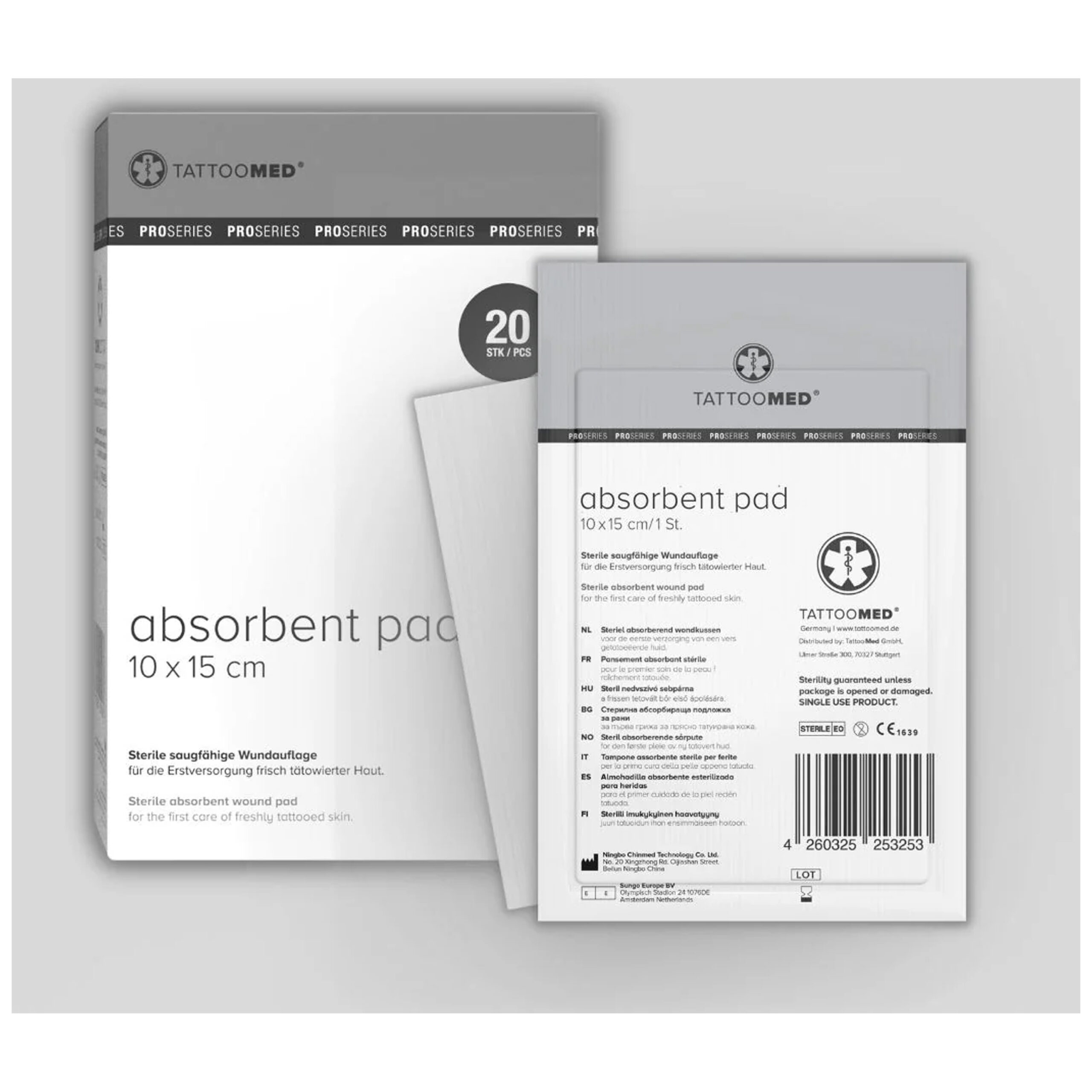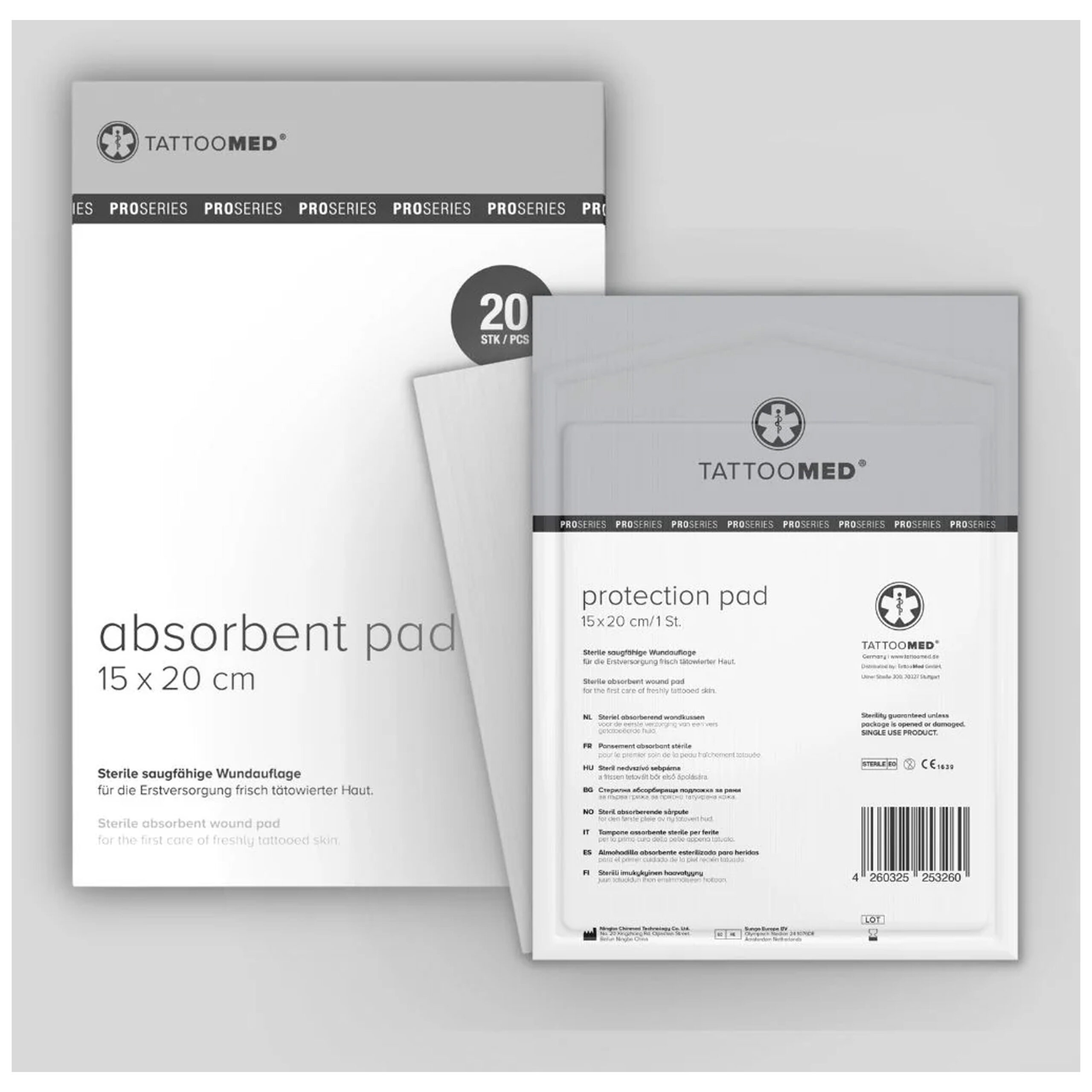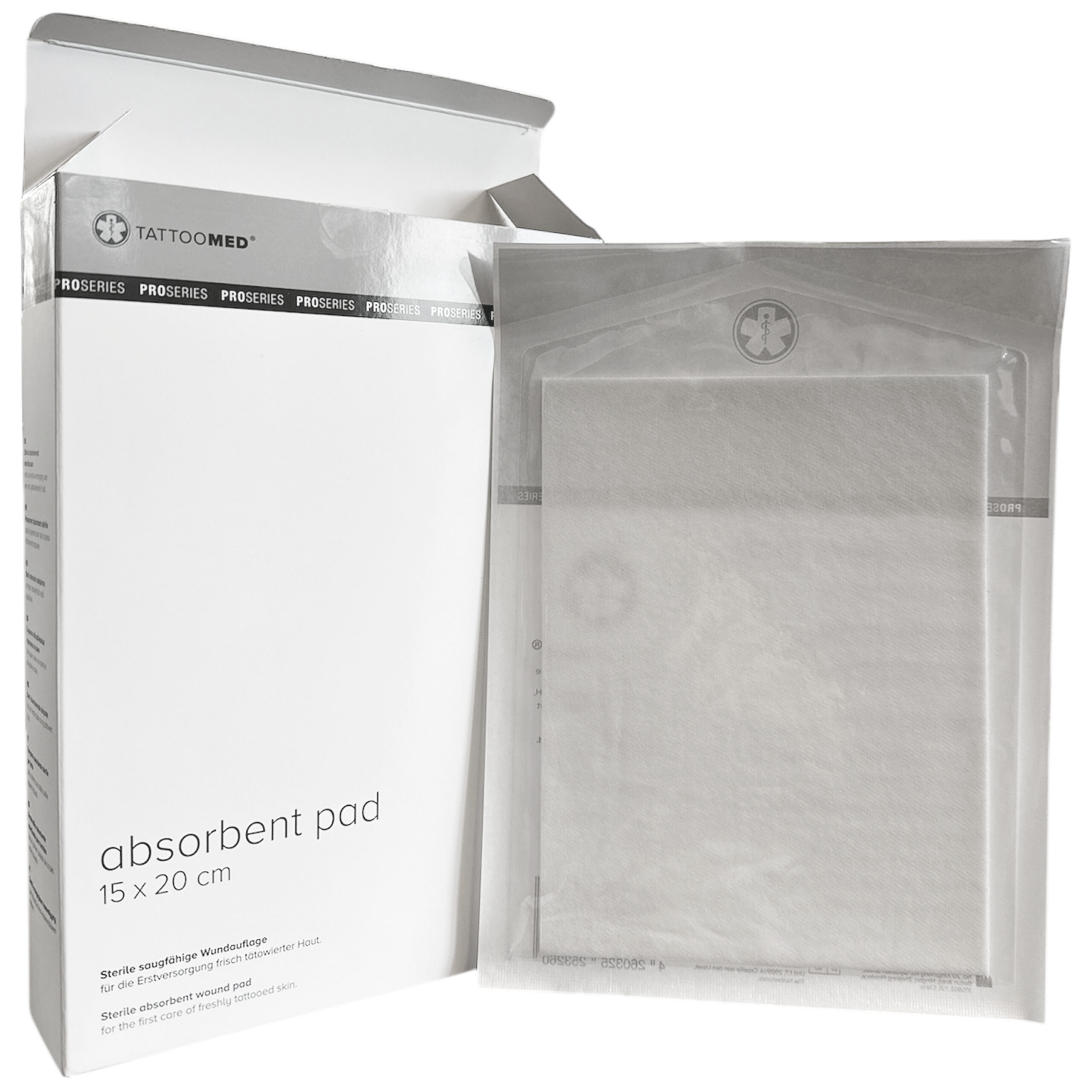 Immediately after lancing, the tattooed skin is cleaned with the Tattoo Finish and then the Absorbent Pad is applied to the tattooed skin and protects the wound from drying out, foreign bodies and creates a moist climate. The Absorbent Pad is attached with TattooMed pro tape black.