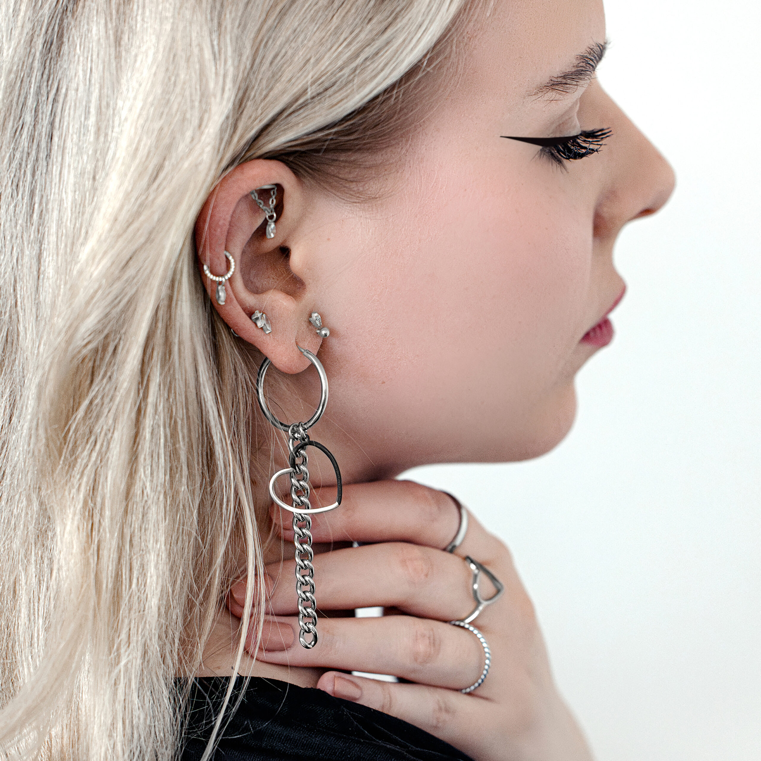 Saranalliset sydänkorvarenkaat tuovat tyyliisi keveyttä ja liikettä. Sydänriipuksella koristeltu ketju mukailee liikkeitäsi ja hurmaa olemuksellaan.