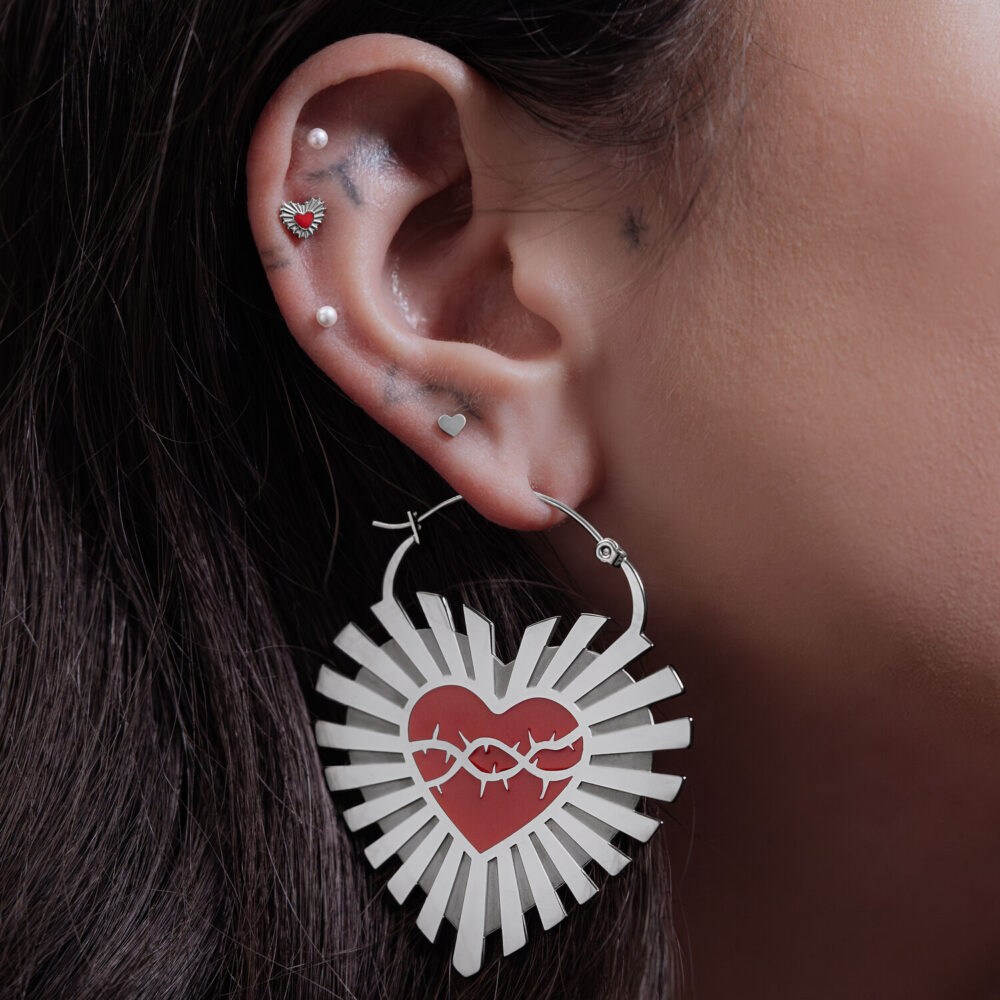 Barbed Wire Sacred Heart Hoops -korvarenkaat yhdistävät henkisyyden ja modernin tyylin upealla tavalla. Korvakorujen keskellä loistaa syvänpunainen sydän, jota ympäröi hienovarainen piikkilanka – symbolinen motiivi, joka edustaa sekä voimaa että suojaa.