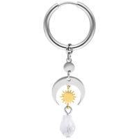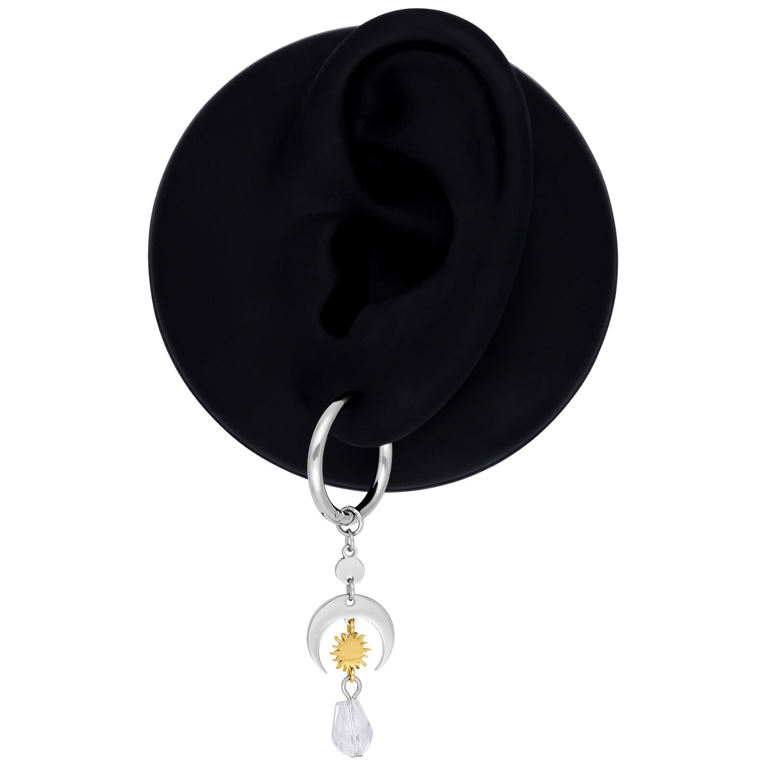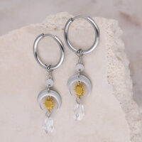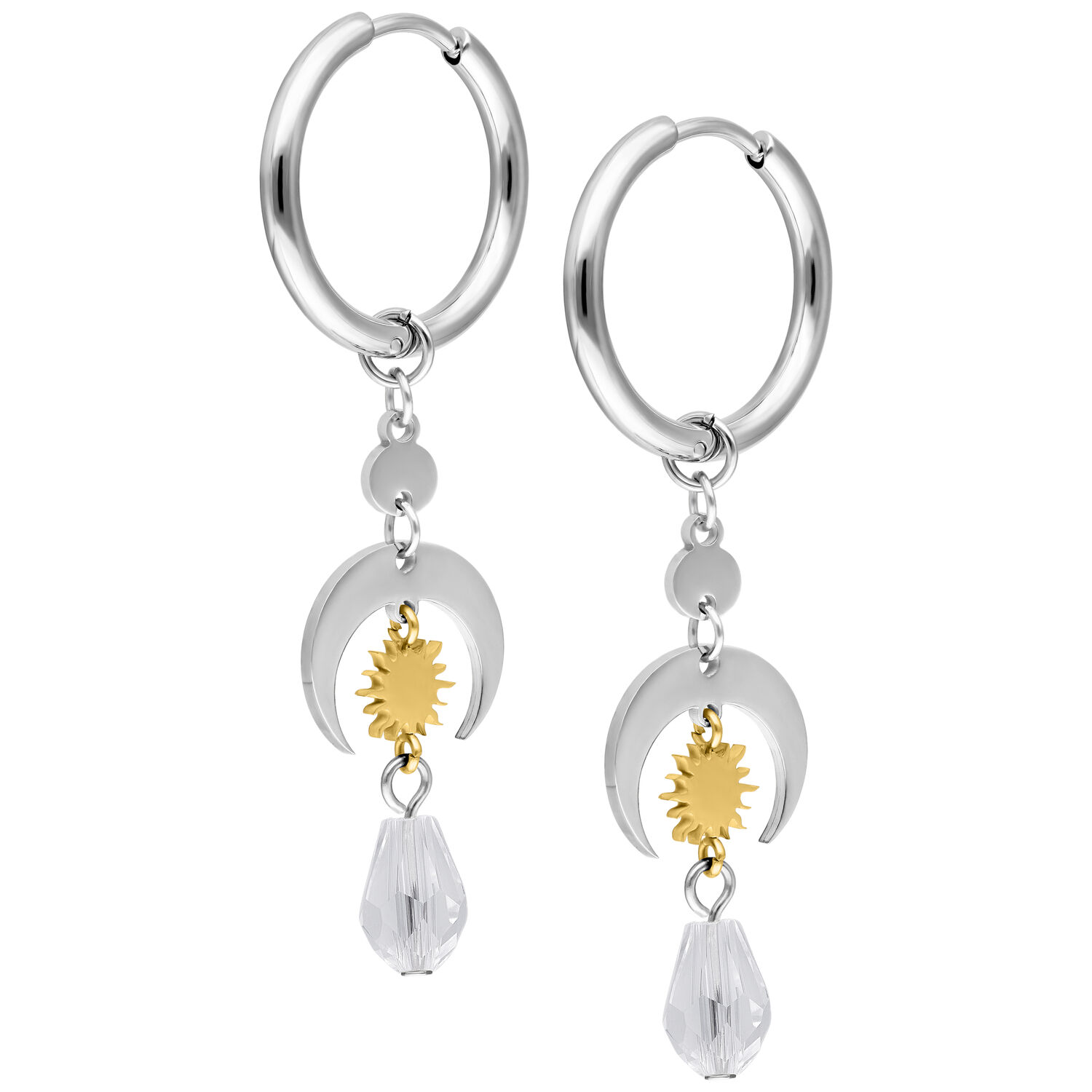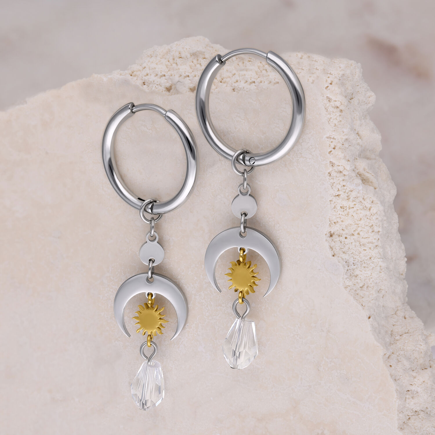 Celestial Light Hoops -korvakorut yhdistävät selkeät metallimuodot ja symboliset, taivaallisesta maailmasta inspiroituneet elementit. Klassisten renkaiden alla avautuu kerroksellinen kokonaisuus: avoin sirppikuu, hienosti viimeistelty auringon muotoinen yksityiskohta kullan sävyisessä viimeistelyssä sekä läpinäkyvä, fasetoitu pisara, joka heijastaa valoa pehmeästi.