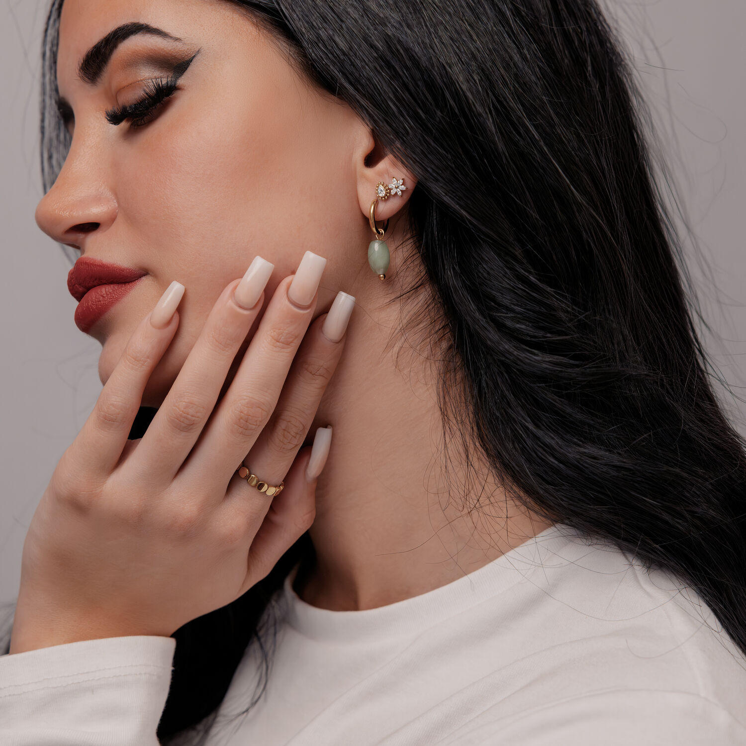 Green Aventurine Drop Hoops -korvakorut yhdistävät ajattoman muotoilun raikkaaseen, moderniin boho-estetiikkaan. Kiillotettu vihreä aventuriinikivi, joka on muotoiltu pehmeäksi pisaraksi, tuo luonnollisen väripilkahduksen sekä kevyen ja eloisan ilmeen. Jokainen pari on yksilöllinen luonnonkiven ainutlaatuisen kuvioinnin ansiosta.