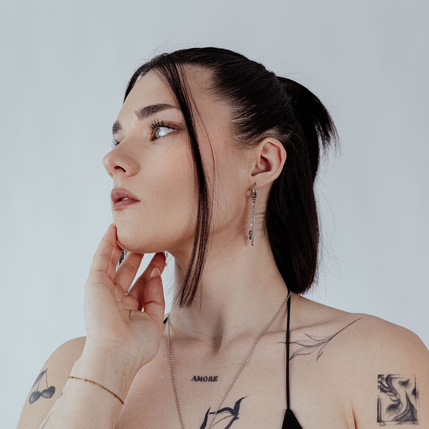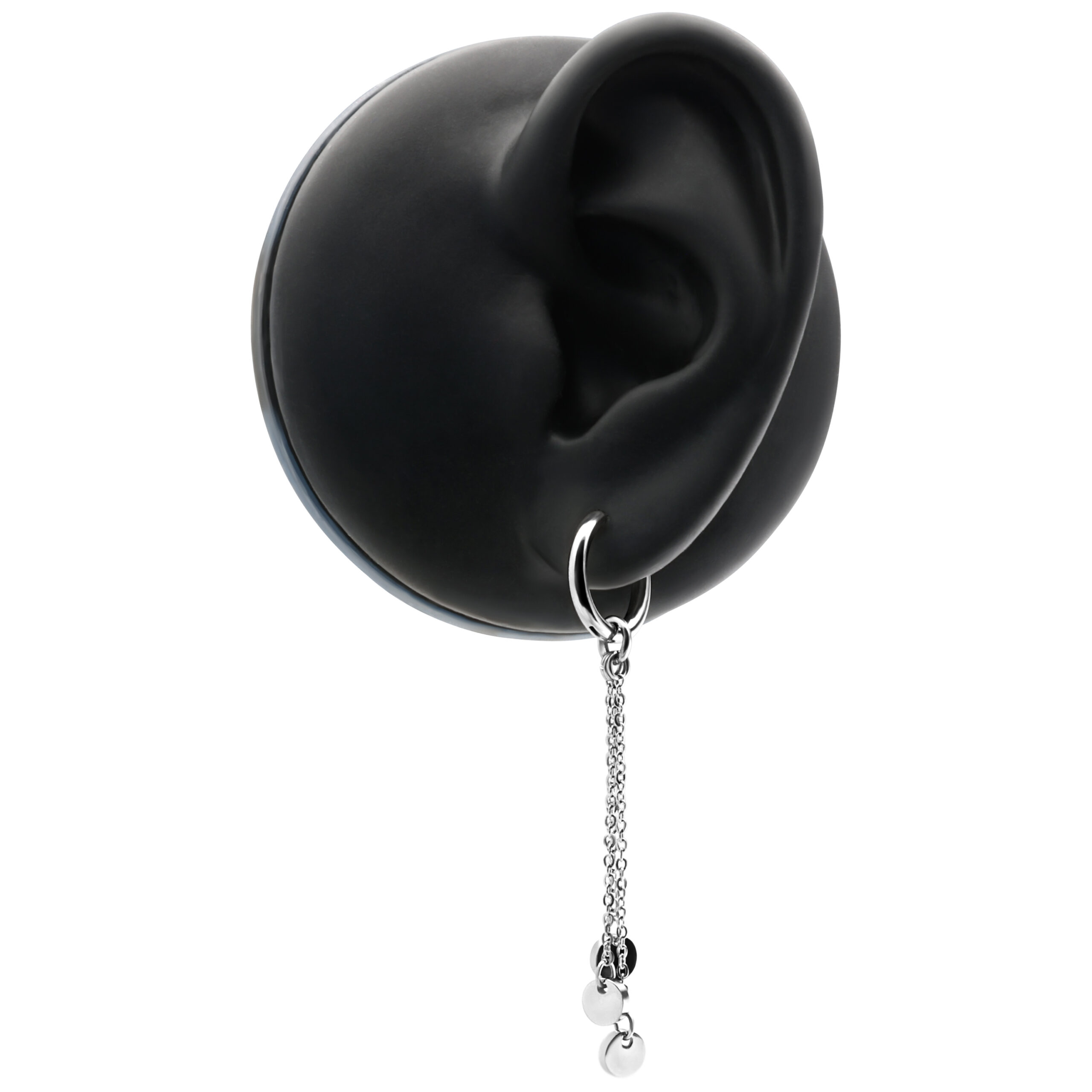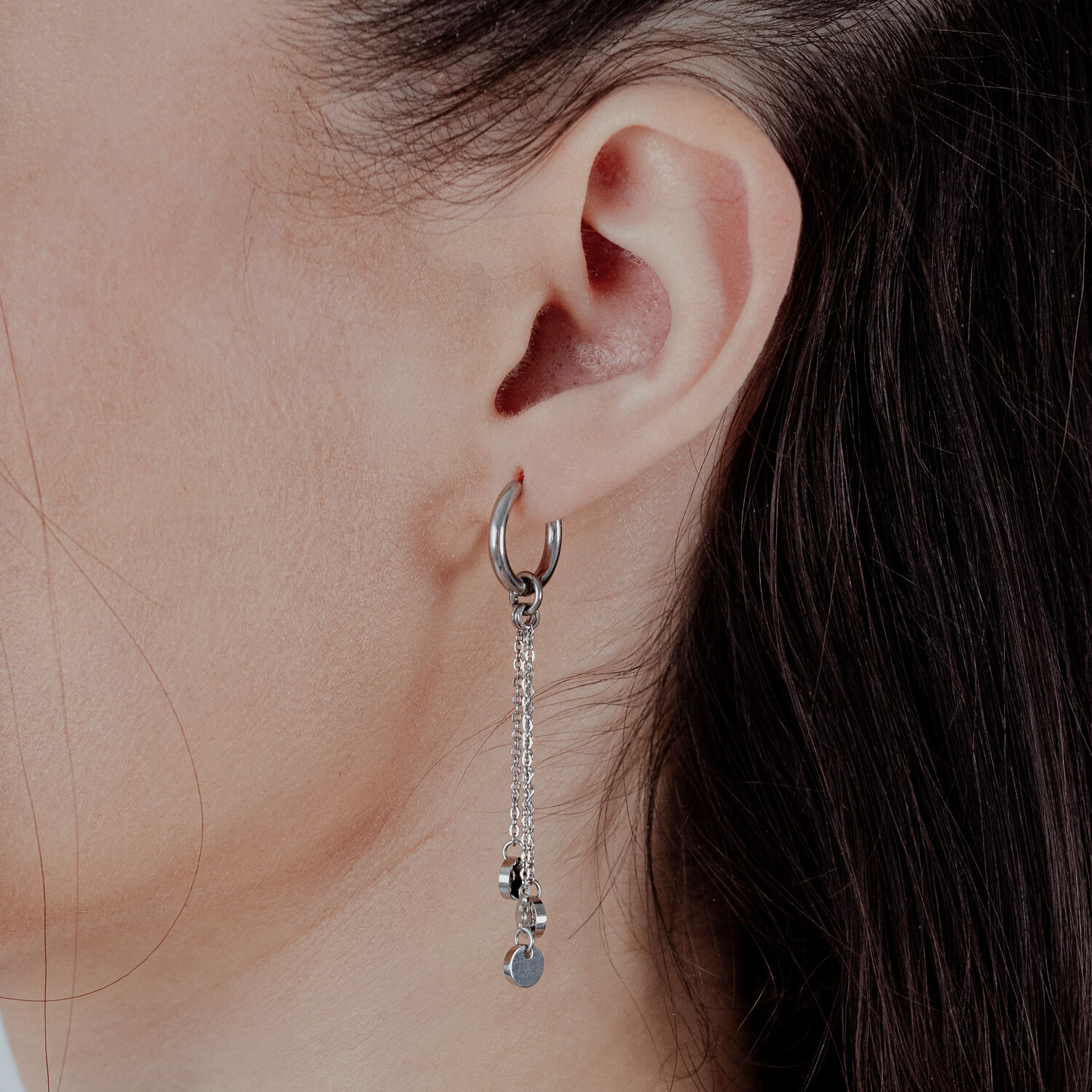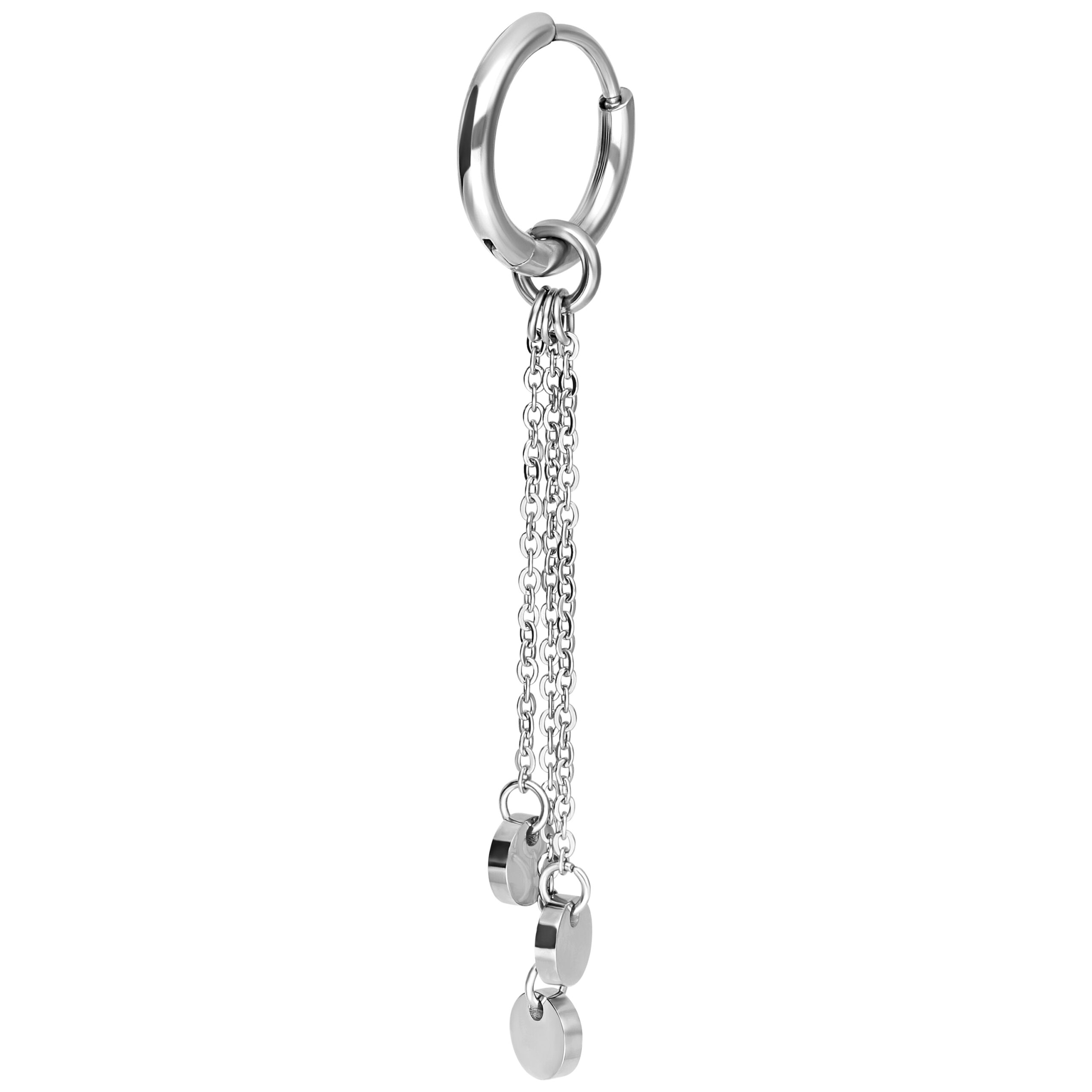 Maaginen korvakoru, jossa yhdistyvät eleganssi ja monipuolisuus: Pieni lävistysrengas, johon on kiinnitetty kolme hienoa ketjua, jotka heiluvat hellästi jokaisen liikkeesi mukana ja luovat kevyen ja kiehtovan tyylin. Halkaisijaltaan 10,0 mm renkaat sopivat käytettäväksi niin normaaleihin korvalävistyksiin että tunneleihin – monikäyttöiset korvakorut!