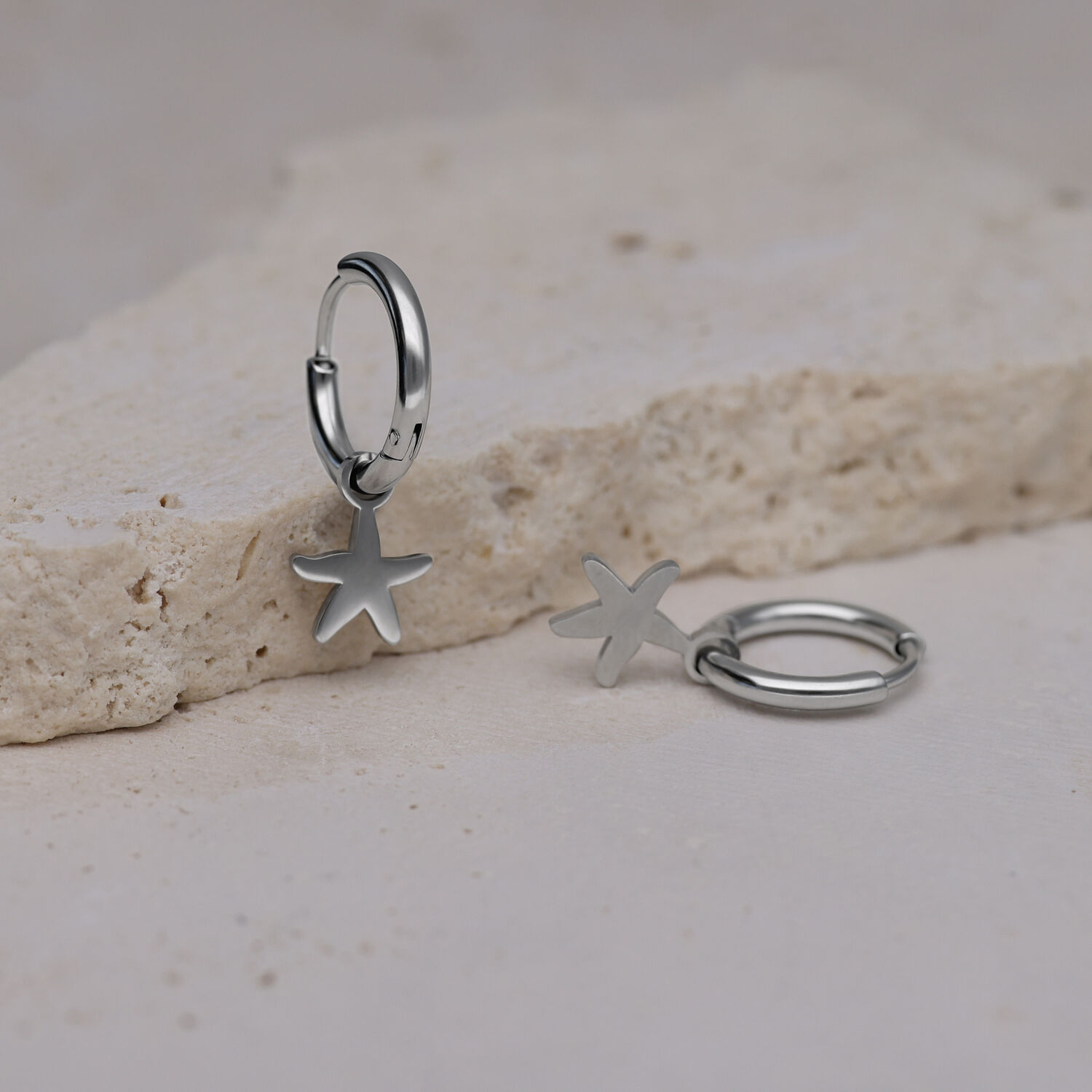 Tuo meri korviisi! Mini Starfish Hoops -korvakorut koostuvat hennon siroista, saranoiduista renkaista, joita koristavat herkät meritähti-riipukset – täydellinen asuste kaikille meren ystäville. Yksityiskohtainen muotoilu tuo tyyliisi raikkaan ja leikkisän vivahteen sekä herättää muistoja auringosta, hiekasta ja suolaisesta ilmasta.