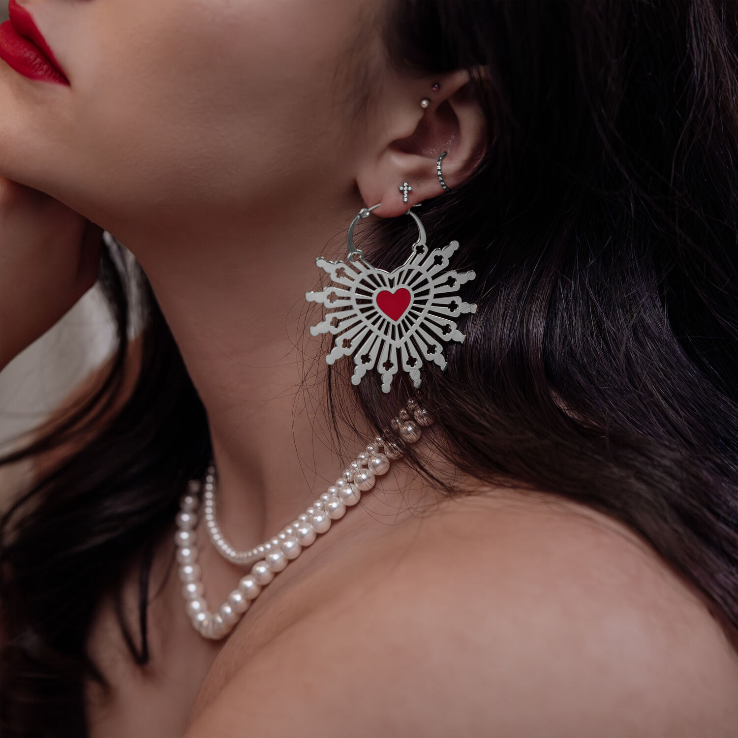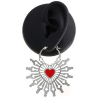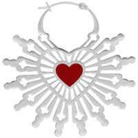 Sacred Heart Hoops -korvakorut yhdistävät voimakkaan symboliikan ja taiteellisen muotoilun. Korvakorujen keskellä loistaa hehkuvan punainen sydän, joka symboloi Pyhän Sydämen intohimoa ja rakkautta. Sydämestä avautuu elegantti kuvio, joka muistuttaa kirkon lasimaalausten hienostuneita yksityiskohtia – herkkiä linjoja ja muotoja, jotka luovat yhteyden henkisen syvyyden ja modernin tyylin välille.
