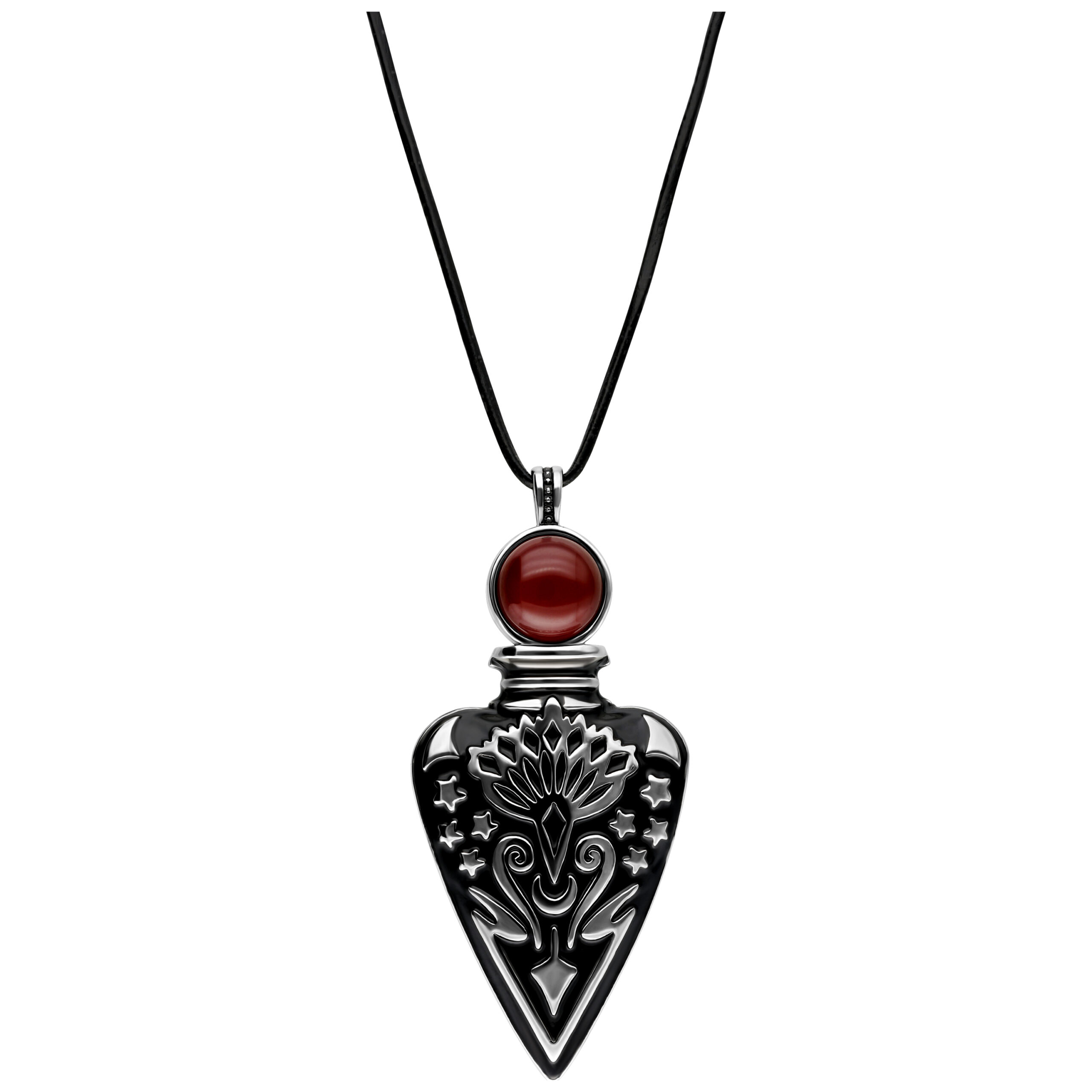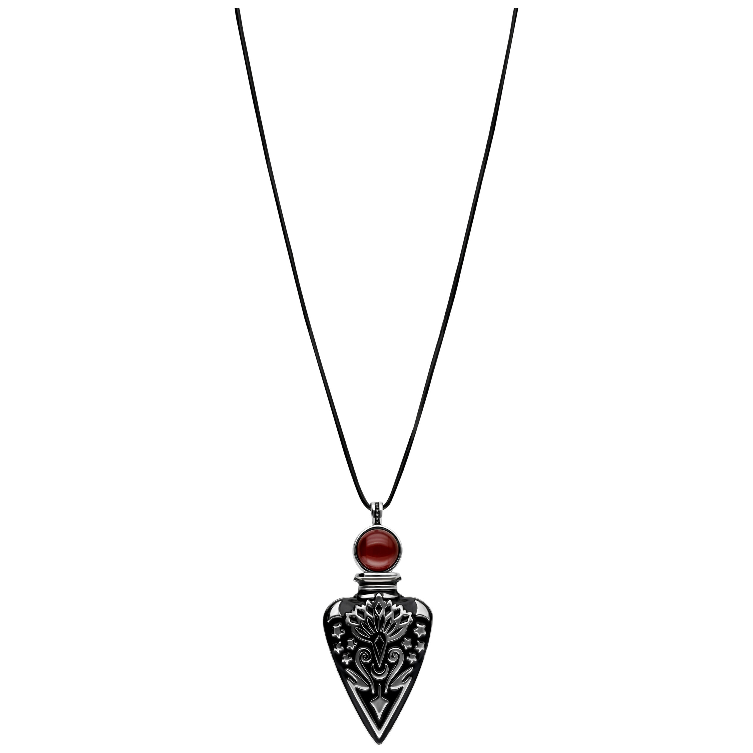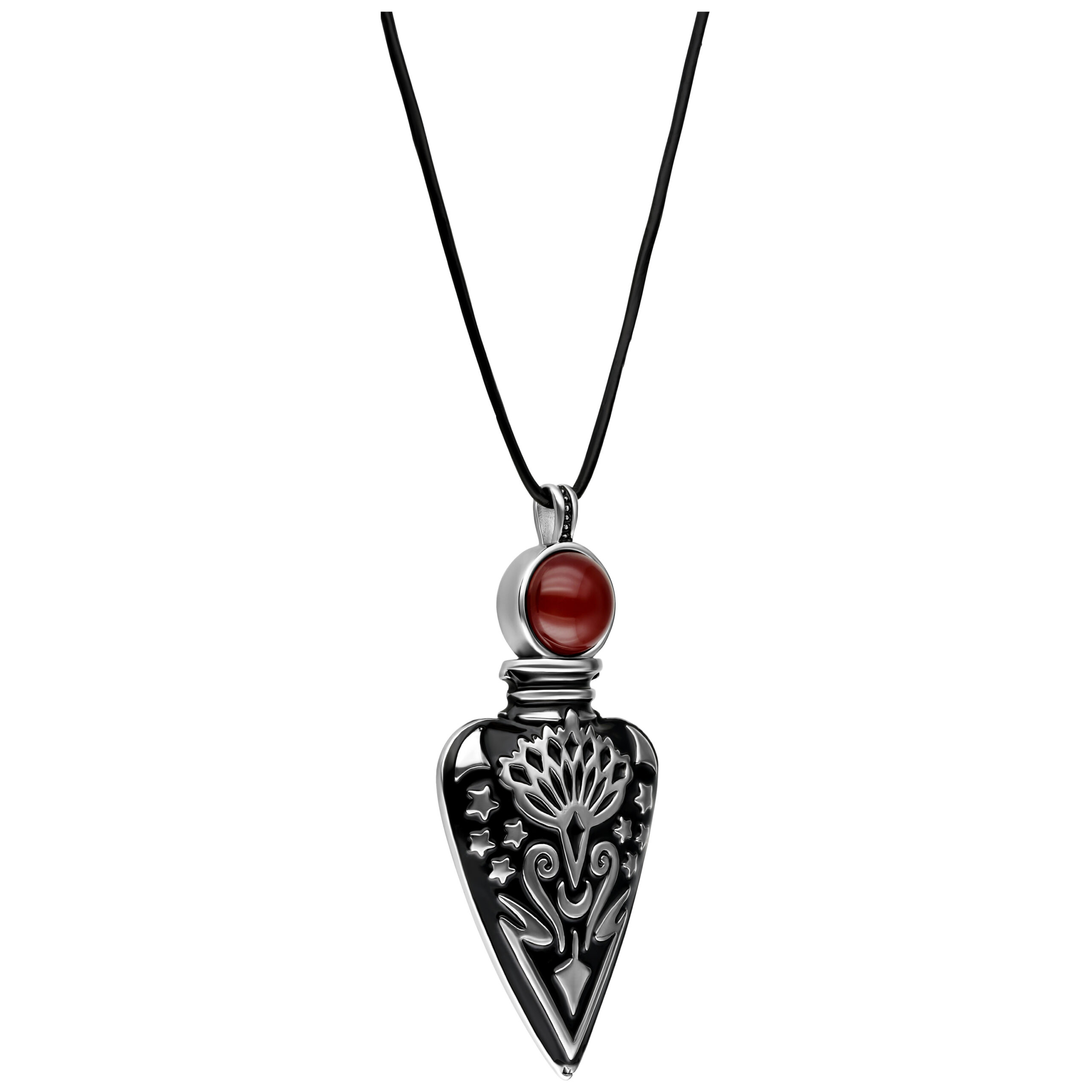Our extraordinary necklace combines mystical charm with a touch of elegance. The pendant in the shape of a tear bottle exudes a mysterious aura and makes a statement. A deep red crystal towers above the bottle, representing passion and energy and giving the design a fascinating accent.