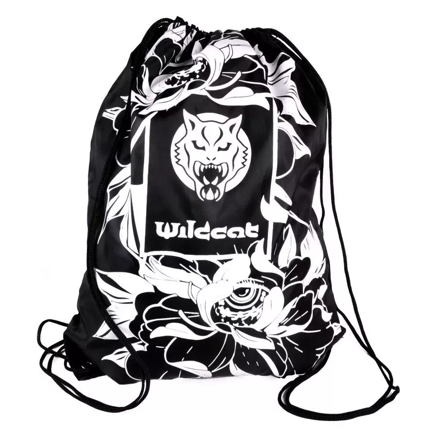 Beautiful black and white string bag with big Wildcat logo and roses on background.