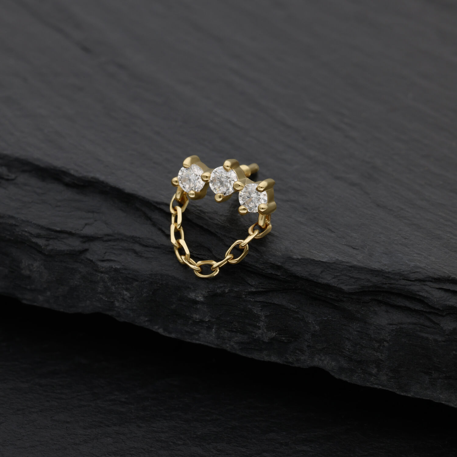Moissanit Bow with Hanger -koristeosa yhdistää modernin tyylin ja hienostuneen ylellisyyden. Se on valmistettu korkealaatuisesta, kiillotetusta 14 karaatin (585) keltakullasta, ja siinä on kolme briljanttihiottua moissaniittikiveä, jotka yhdistyvät toisiinsa herkän kultaketjun avulla – luoden hienostuneen tasapainon rakenteen ja säihkeen välille.