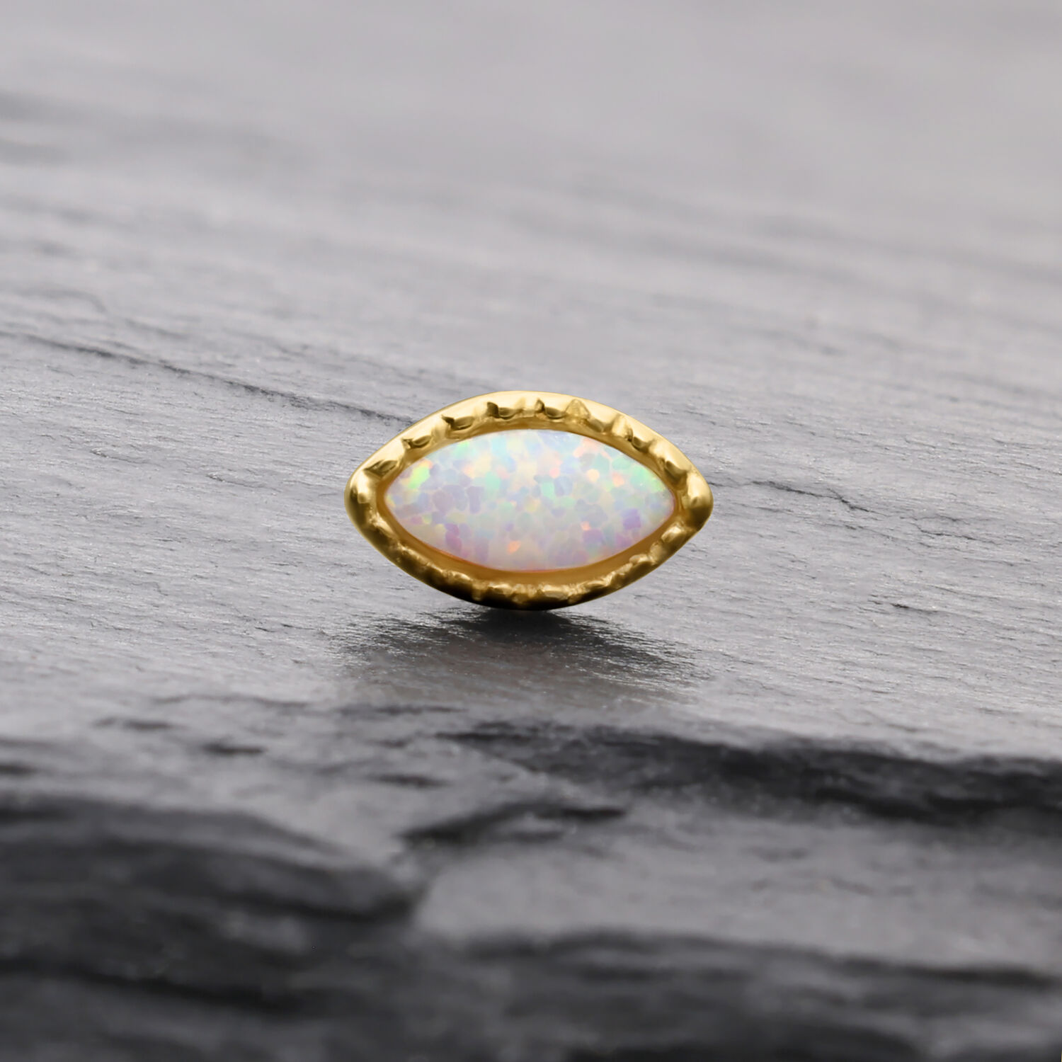 Tässä kultaisessa koristeosassa yhdistyvät hienon 14 karaatin (585) keltakullan kiilto ja synteettisen soikean opaalin hienostuneisuus. Erityisesti Wildcat® – 14K Perfect Fit Labretille suunniteltu upea koristeosa tekee vaikutuksen tyylikkäällä muodollaan ja jalokiven kiehtovalla värien leikillä. Koristeosan koko on 3,9 x 2,3 mm ja paino vain 0,07 g, joten se on ihanteellinen kaikille, jotka pitävät hienovaraisista ja laadukkaista lävistyskoruista.