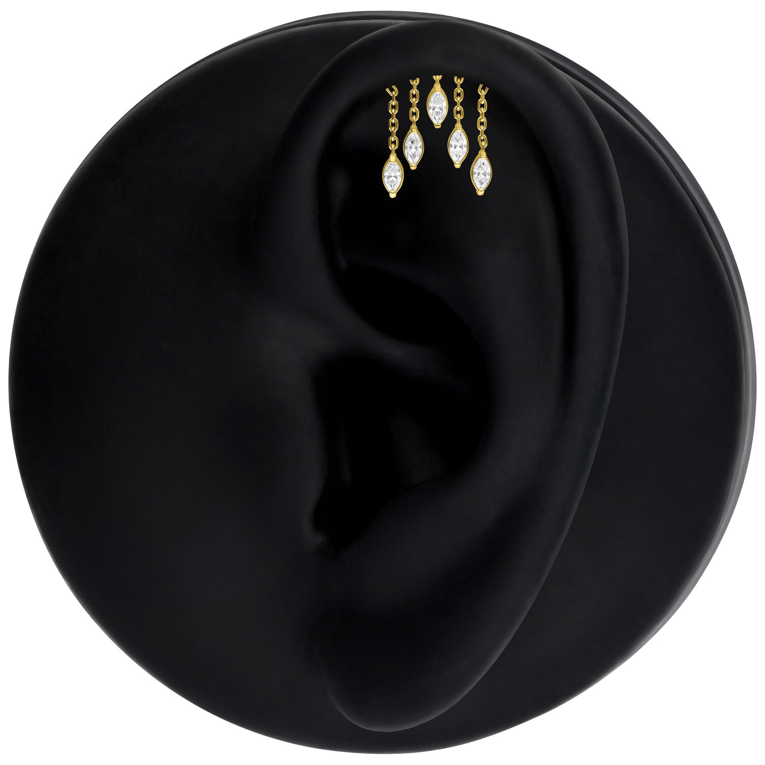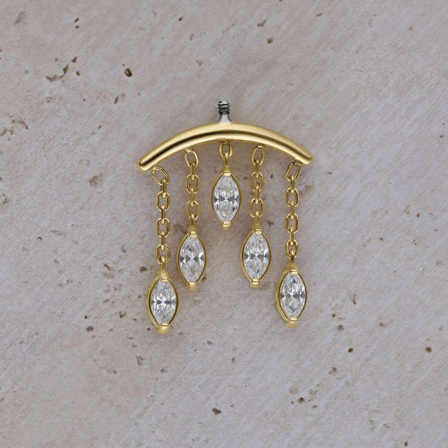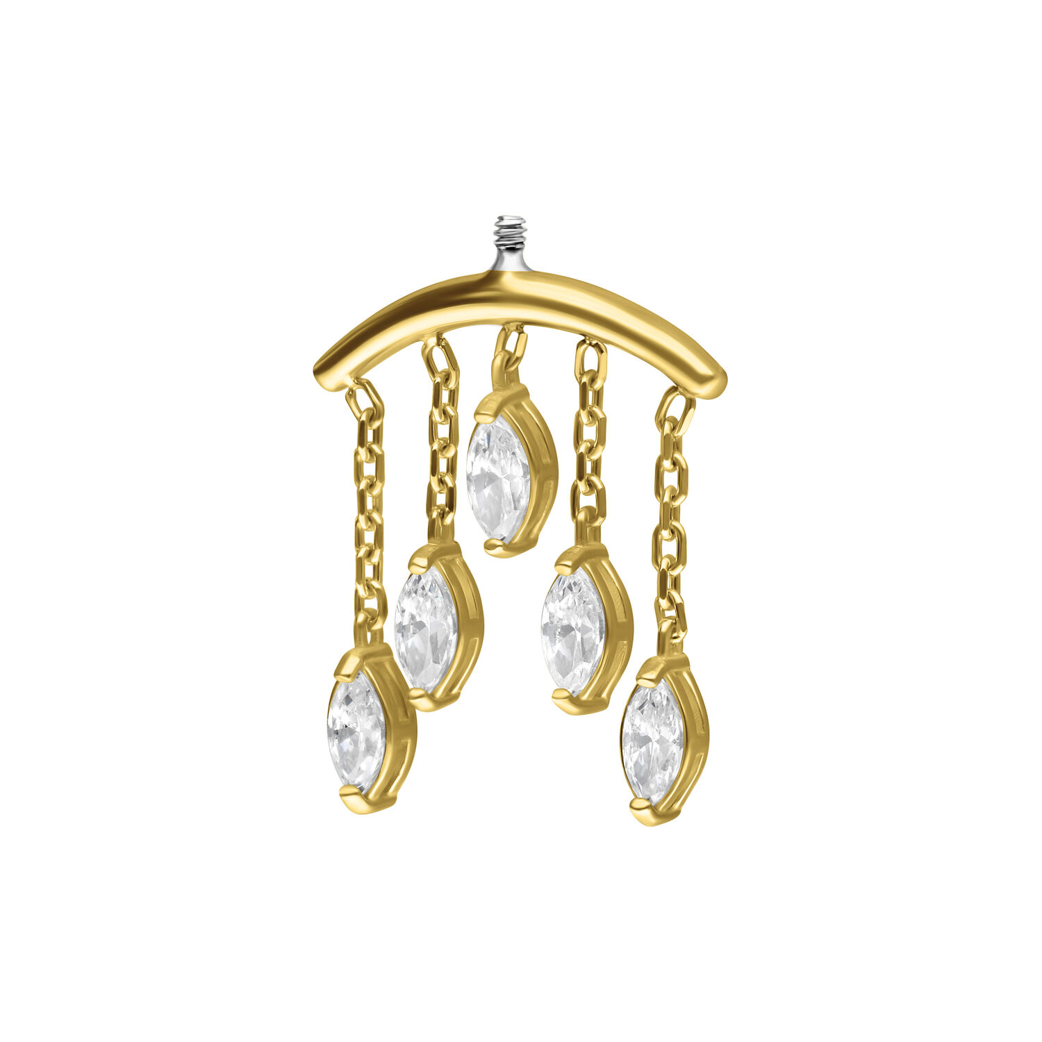 Etsitkö eksklusiivisia ja ylellisiä lävistyskoruja? Silloin olet oikeassa paikassa, sillä Wildcat-mallistomme tarjoaa kaiken mitä voit toivoa. Internally Oval Crystal Drops Hidden Helix -koristeosa on valmistettu 18 karaatin (750) keltakullasta. Sisäkierteinen tappi on valmistettu 316L ruostumattomasta teräksestä.