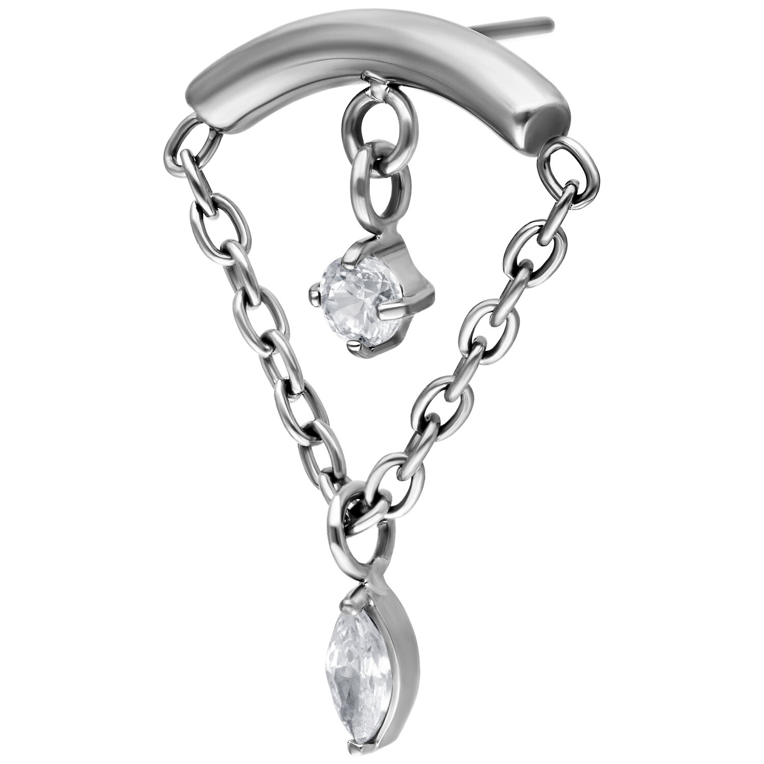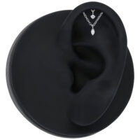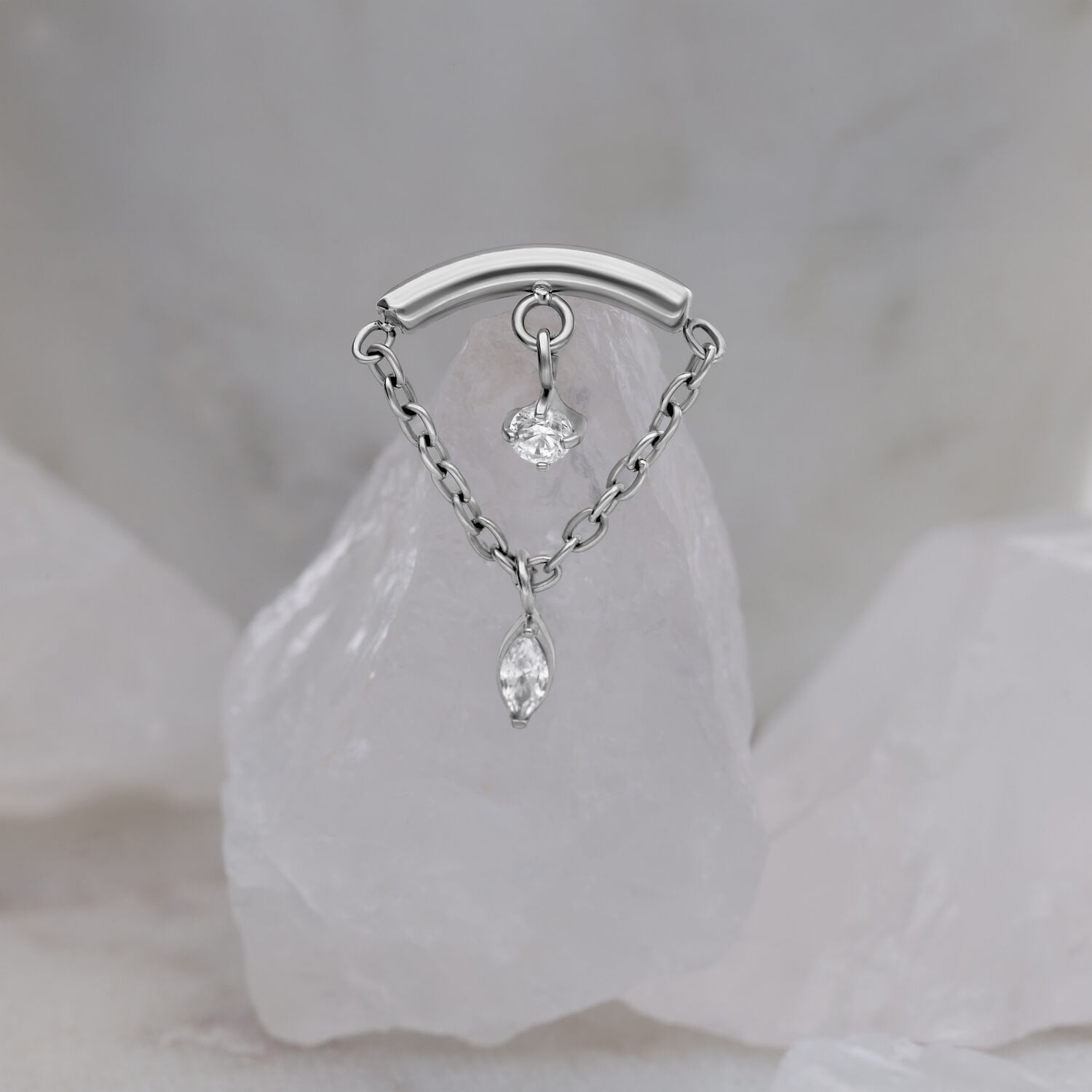 Double Jewelled Hidden Helix Push Fit -koristeosa on tyylikäs helix-koriste, joka istuu huomaamattomasti korvan taitteeseen. Grade 23 -titaanista valmistettu koru kiinnittyy huomaamattomasti lävistykseesi, samalla kun kaksi hentoa ketjua laskeutuvat kauniisti, paljastaen ylemmän kimaltavan pyöreän kristallin ja alemman marquise-hiotun kristallin.