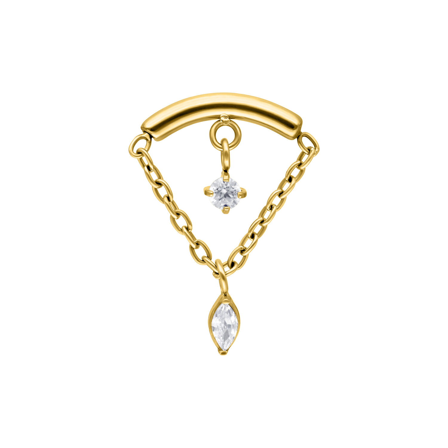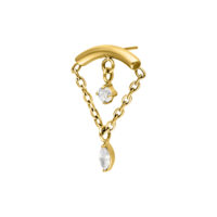 Double Jewelled Hidden Helix Push Fit -koristeosa on tyylikäs helix-koriste, joka istuu huomaamattomasti korvan taitteeseen. Grade 23 -titaanista valmistettu koru kiinnittyy huomaamattomasti lävistykseesi, samalla kun kaksi hentoa ketjua laskeutuvat kauniisti, paljastaen ylemmän kimaltavan pyöreän kristallin ja alemman marquise-hiotun kristallin.
