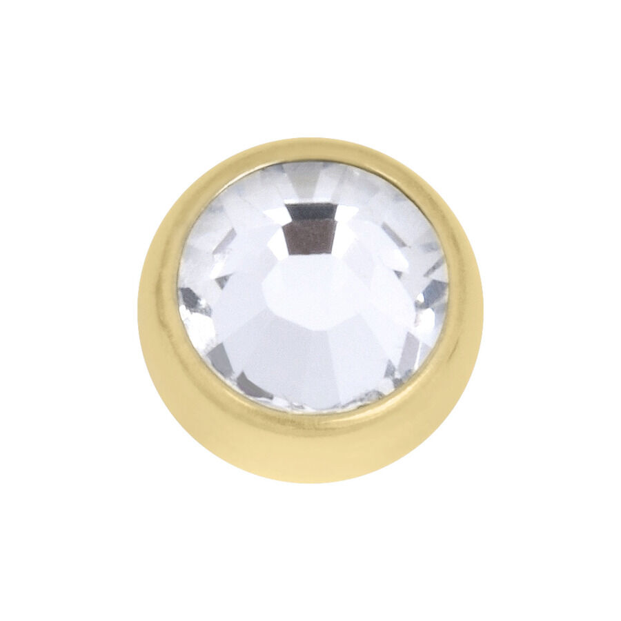 Gewindekugel aus 750er Gelbgold (18kt) mit Kristall zum Aufschrauben auf Gewindestäbe. Diese Kugel ist in verschiedenen Größen und Gewindestärken erhältlich. Dieser Artikel ist relativ schwer und sterilisierbar. Das Material ist bei bestimmungsgemäßen Gebrauch unbedenklich.