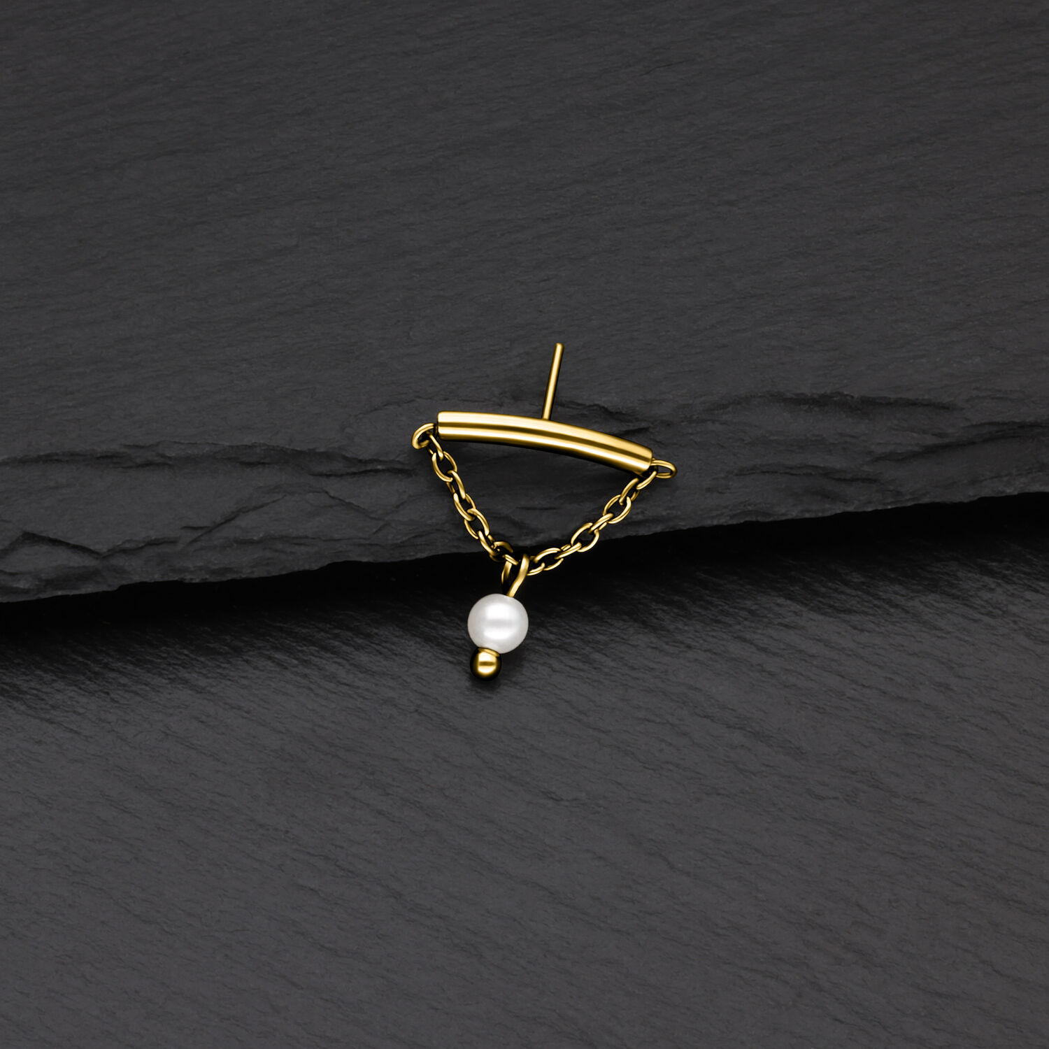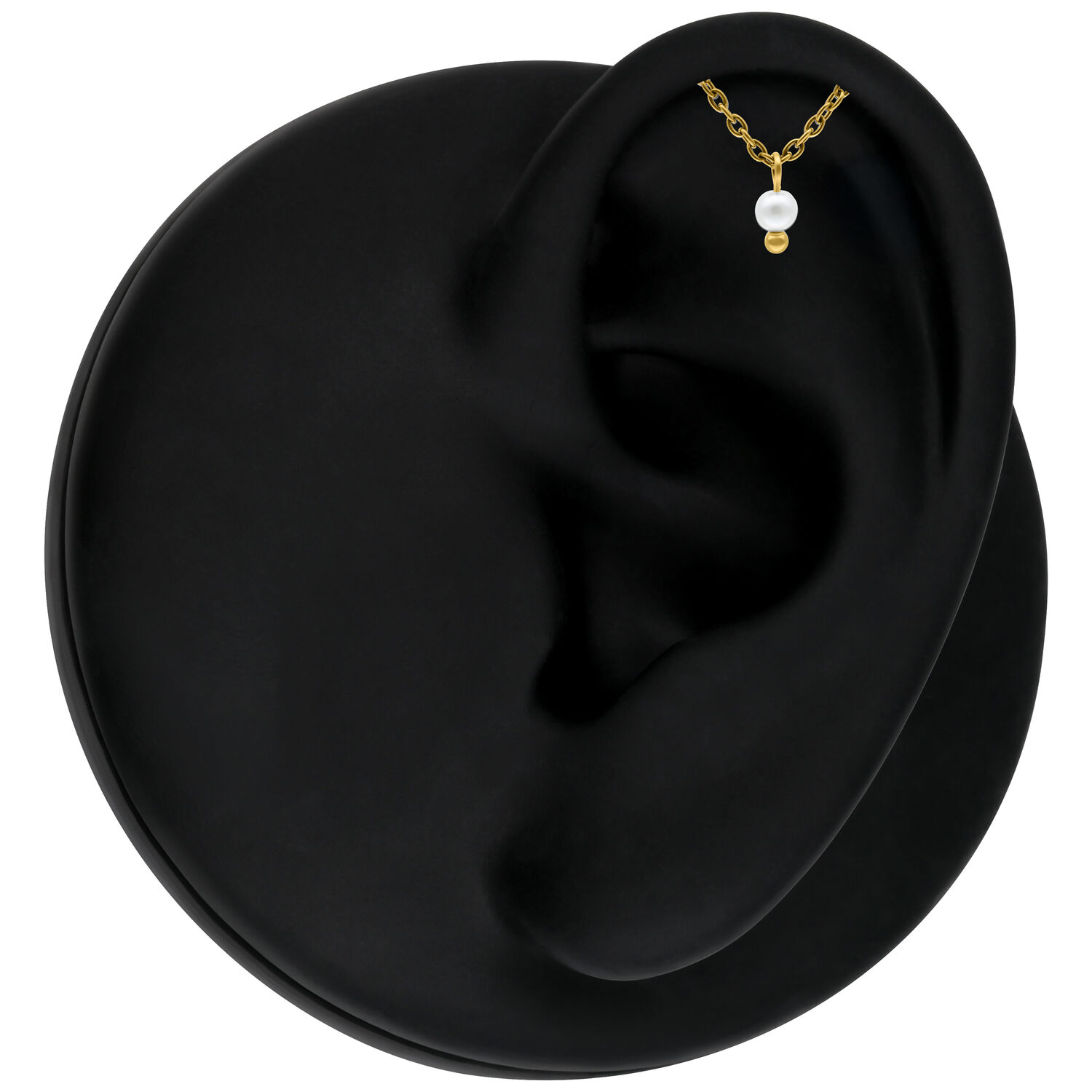 In this attachment, cool, high-quality titanium meets innovative design. This attachment is perfectly suited for your hidden helix. The curved bar hides seamlessly in your ear fold, leaving only the delicate chain visible, giving your look an elegant and truly unique flair.
