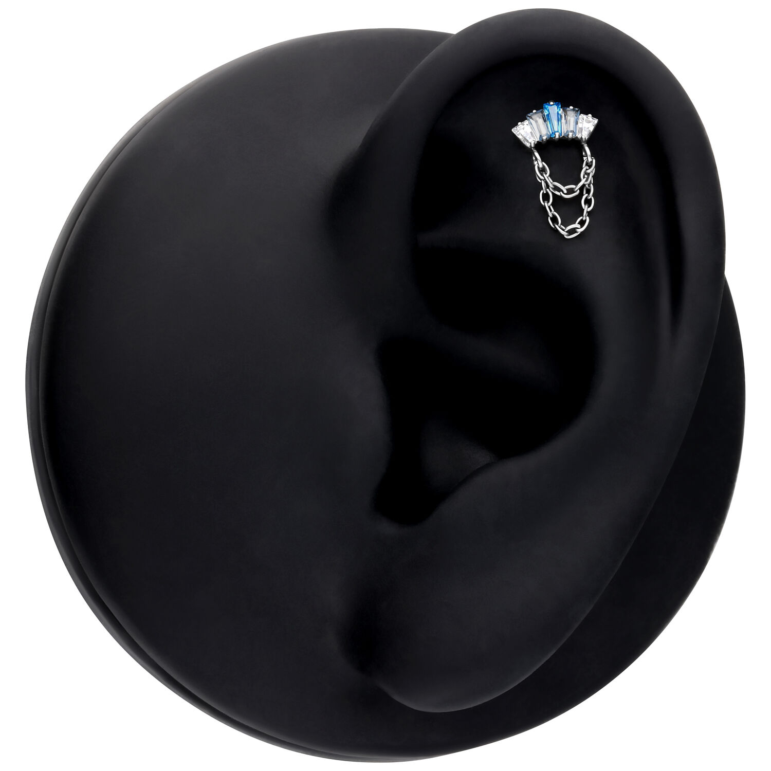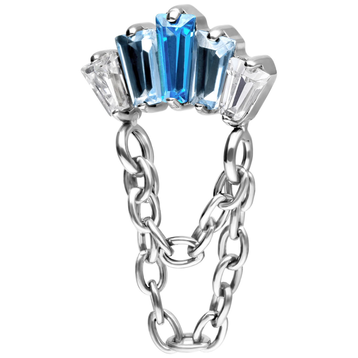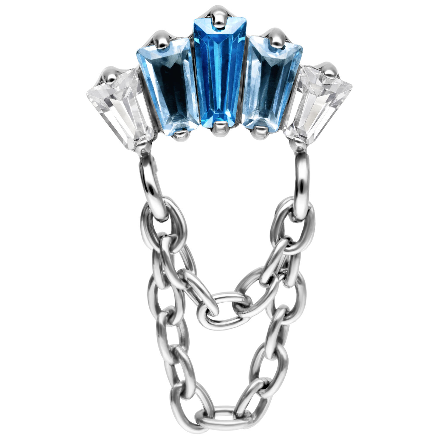 Push Fit Crystal Harmony Attachment yhdistää kimaltelevan eleganssin erityiseen muotoiluun. Kaksi kaunista ketjua, jotka on valmistettu Grade 23 titaanista täydentävät muotoilua ja antavat lävistyskorulle ylellisen, virtaavan ulkonäön. Voit valita ketjujen väriksi joko kullan tai hopean.