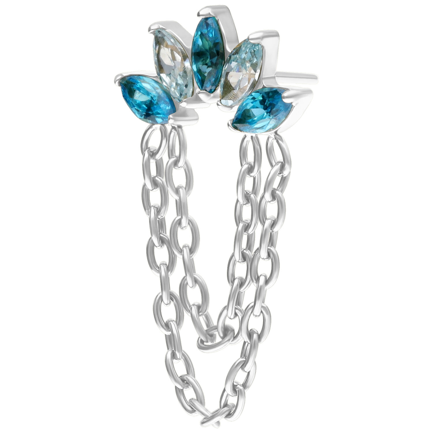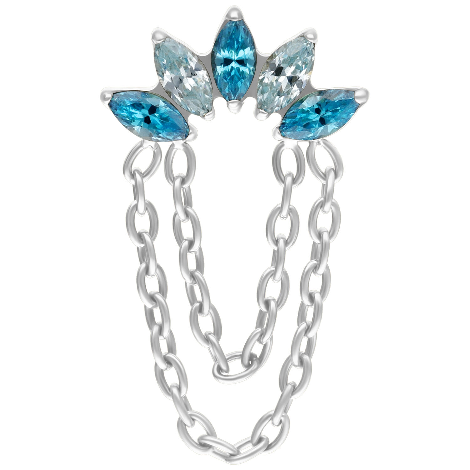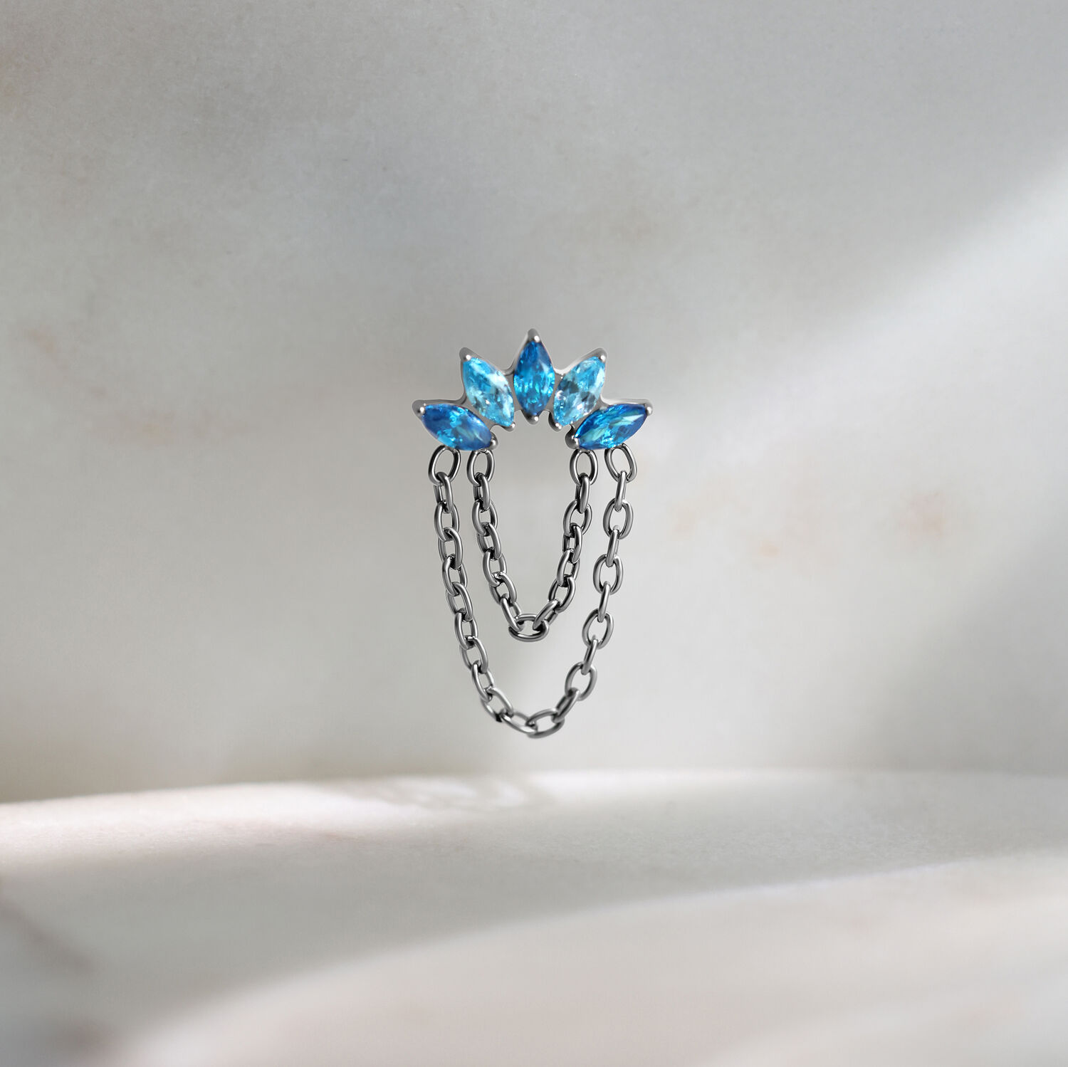 Turkoosin ja laventelin väriset kristallit kimaltelevat herkästi ja vangitsevat valon jokaisen liikkeen. Kaksi hienoa ketjua, jotka on valmistettu tyylikkäästä hopean tai kullan värisestä titaanista (Grade 23), täydentävät muotoilua ja antavat koristeosalle ylellisen, virtaavan luonteen – yksityiskohta, joka kääntää välittömästi katseet ja antaa lävistyksellesi vertaansa vailla olevaa syvyyttä.