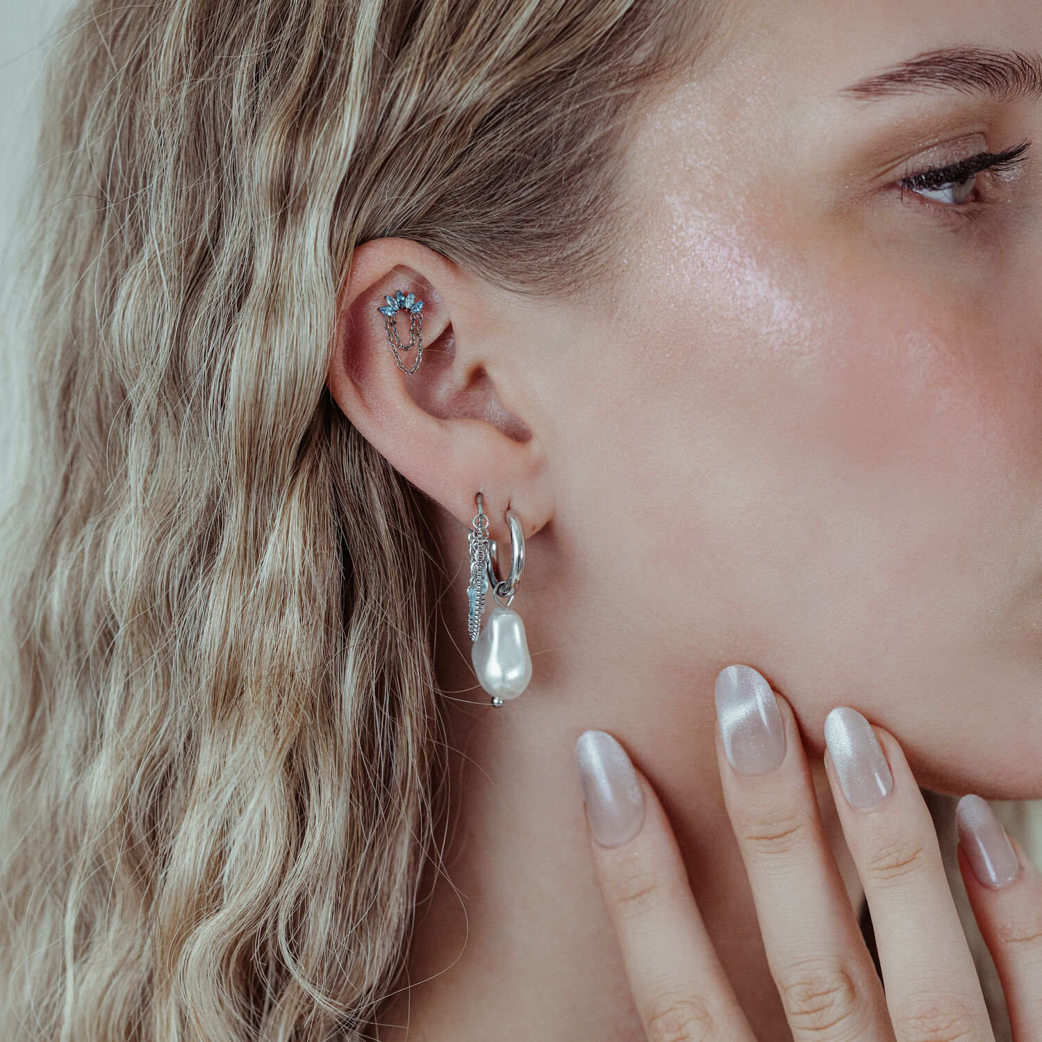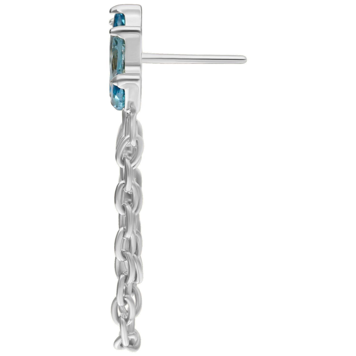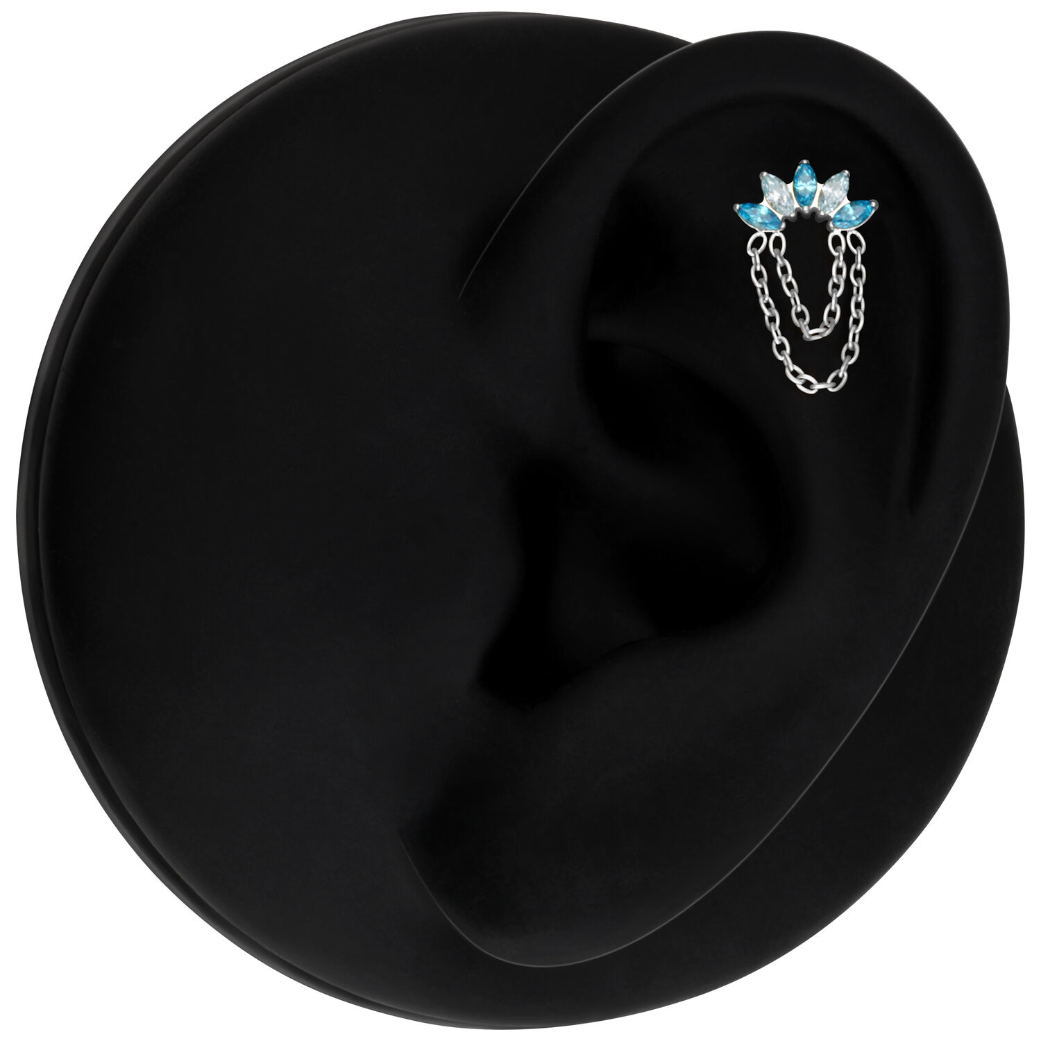 Turkoosin ja laventelin väriset kristallit kimaltelevat herkästi ja vangitsevat valon jokaisen liikkeen. Kaksi hienoa ketjua, jotka on valmistettu tyylikkäästä hopean tai kullan värisestä titaanista (Grade 23), täydentävät muotoilua ja antavat koristeosalle ylellisen, virtaavan luonteen – yksityiskohta, joka kääntää välittömästi katseet ja antaa lävistyksellesi vertaansa vailla olevaa syvyyttä.