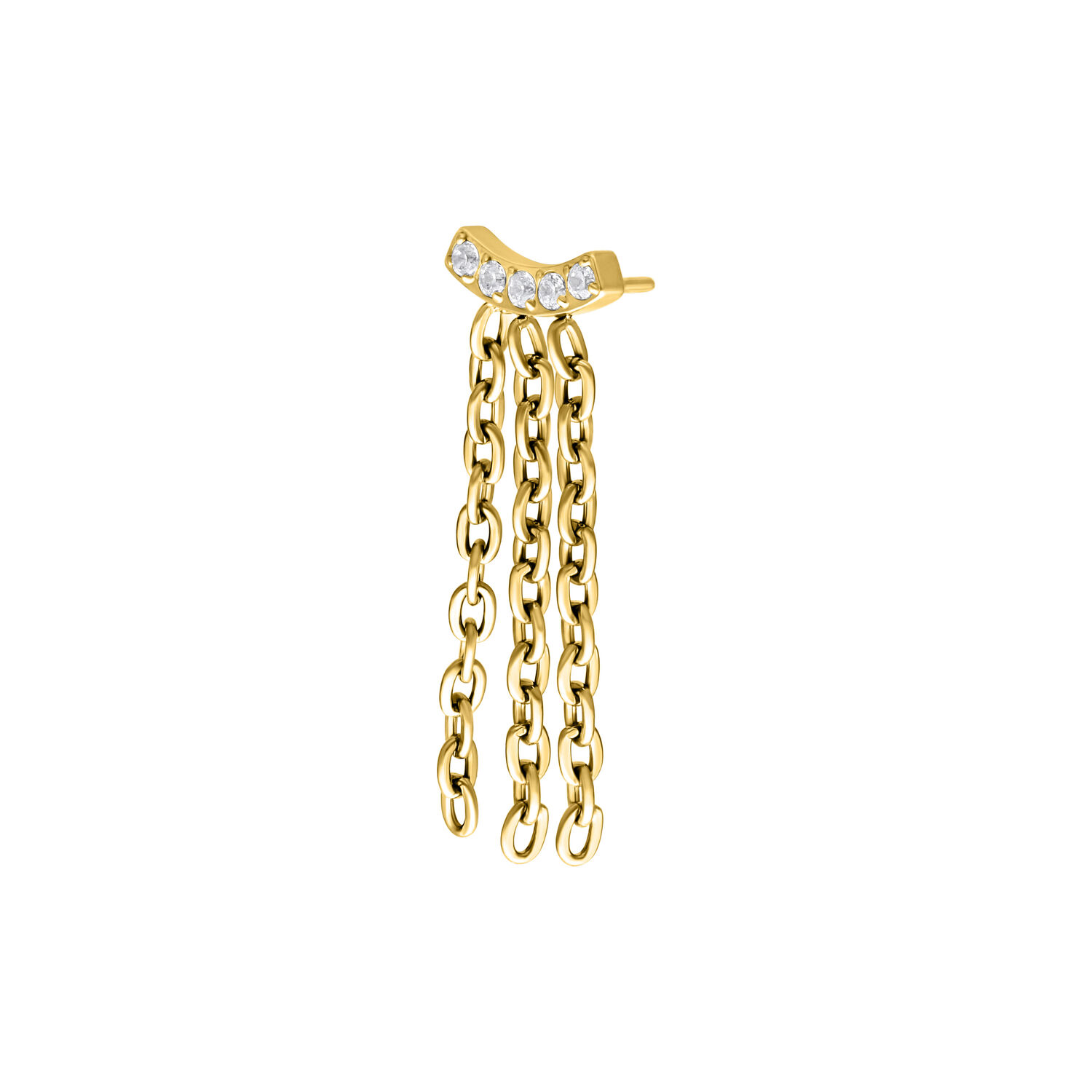 Tämä push-in-koristeosa on valmistettu korkealaatuisesta titaanista ja koristeltu kristallikoristeesta putoavilla ketjuilla. Tämä koristeosa antaa lävistyskorullesi tyylikkään, mutta samalla leikkisän ulkonäön.