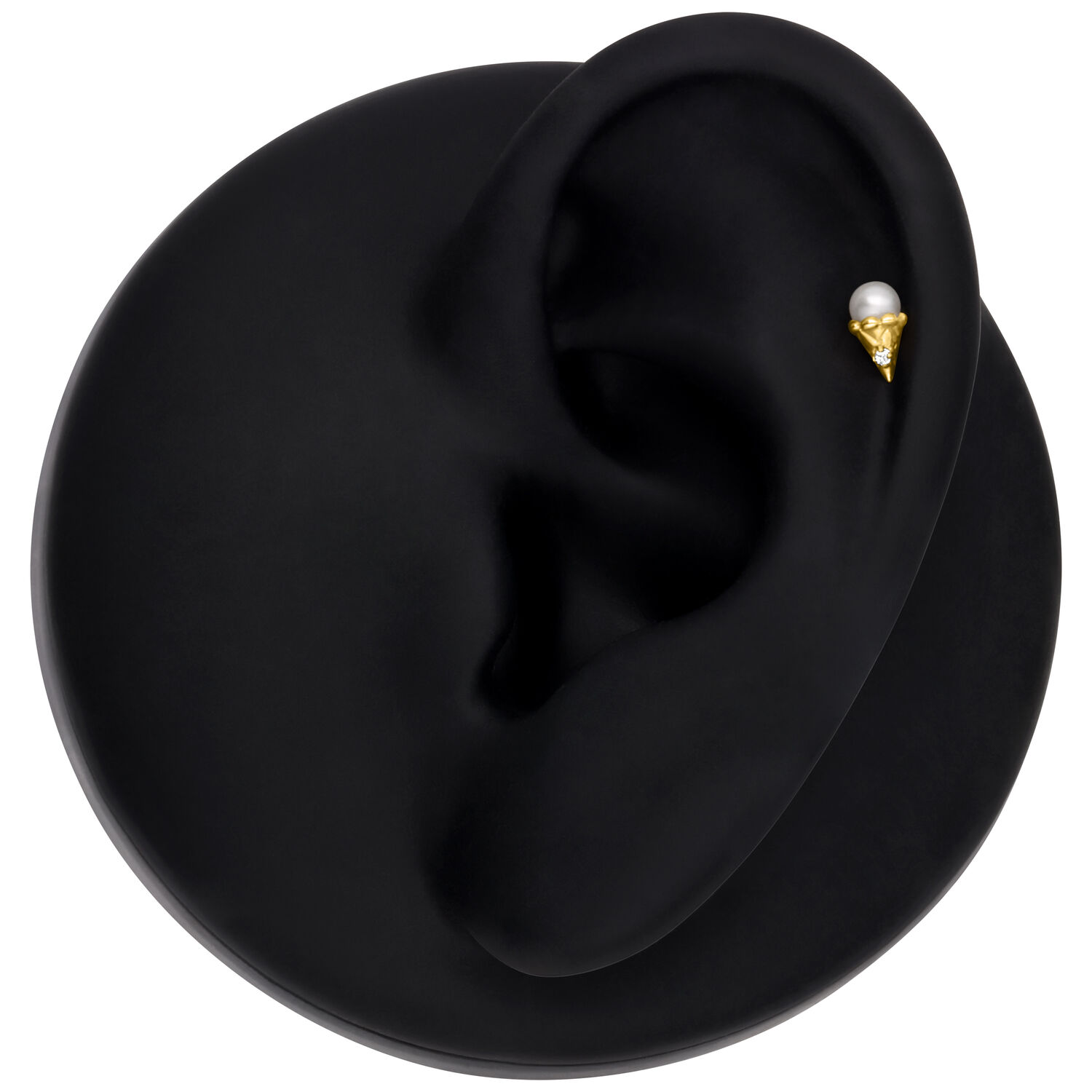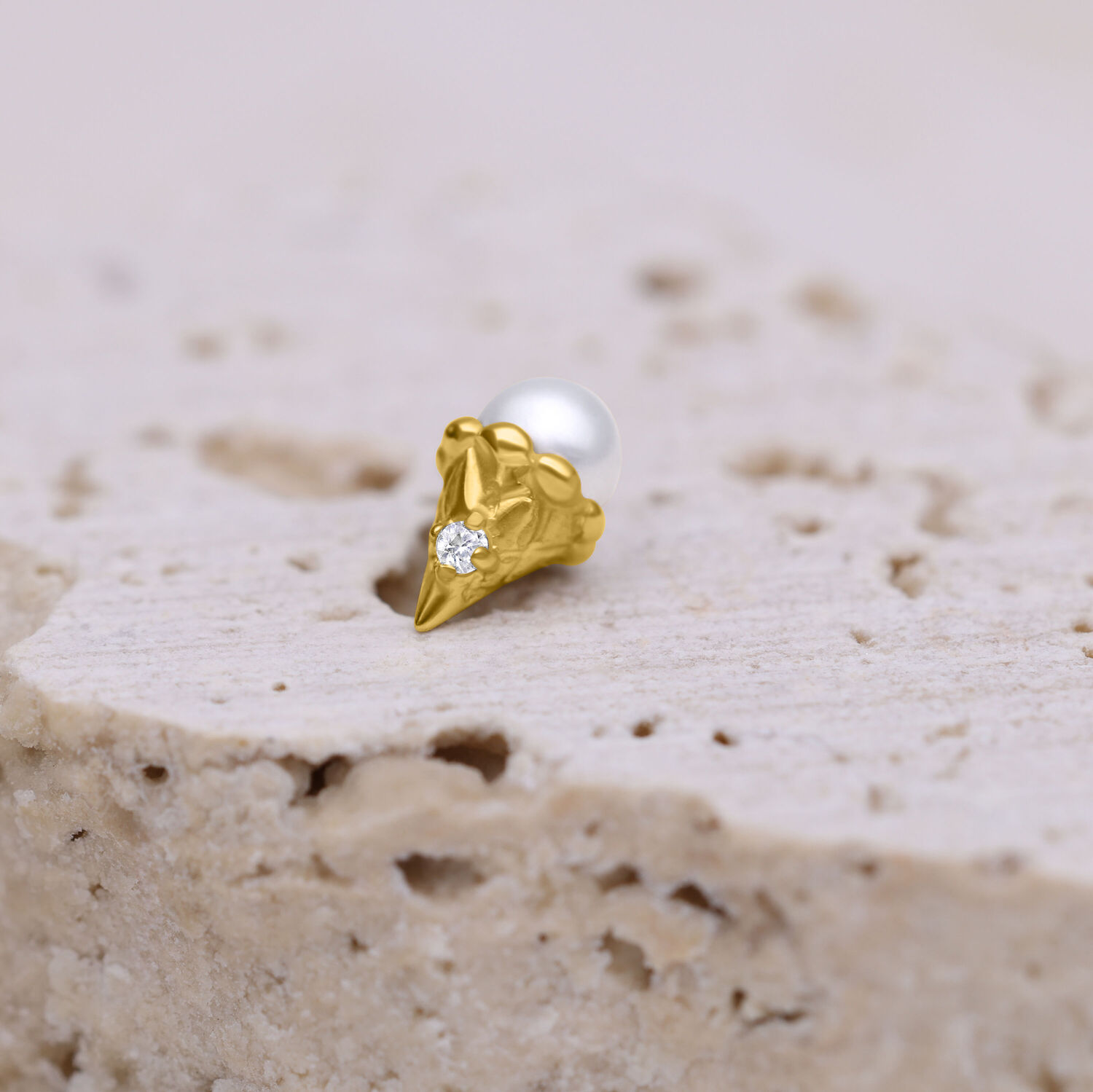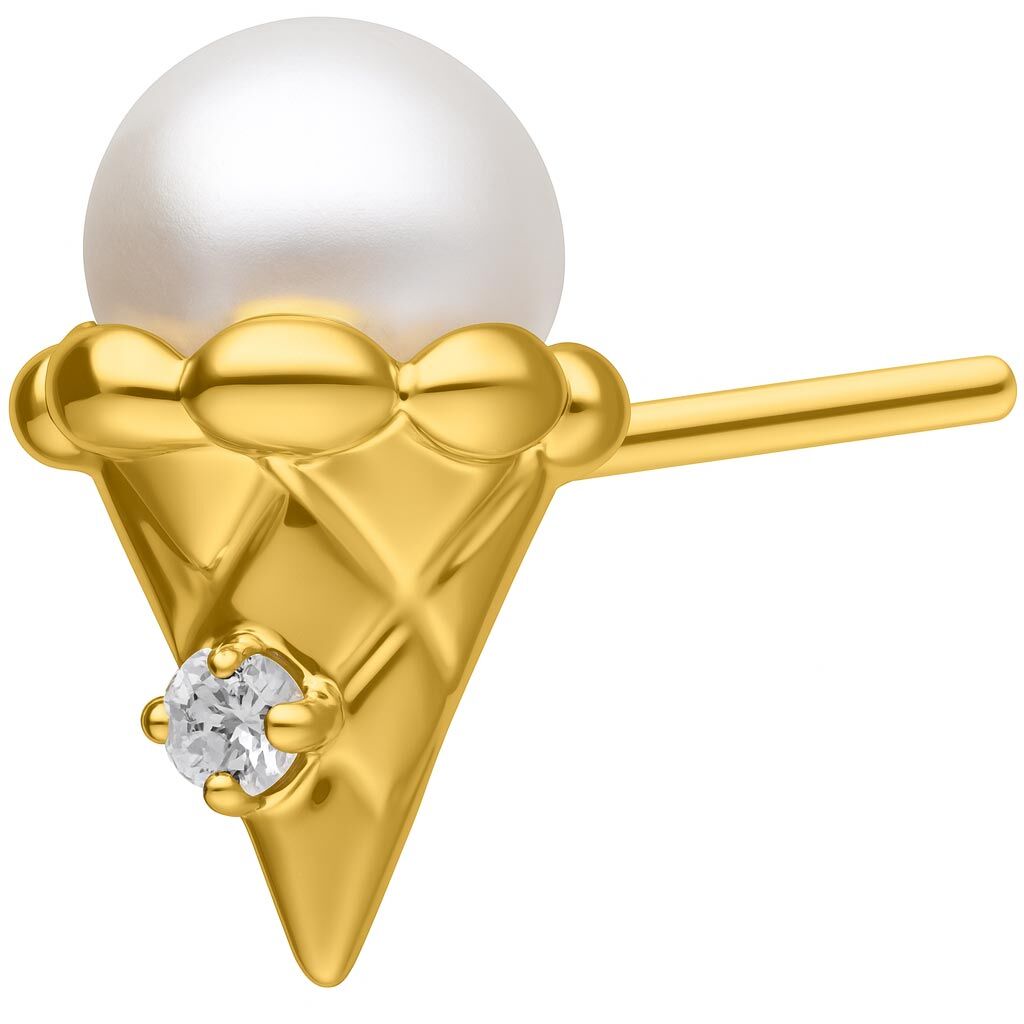 Tämä implanttitasoisesta titaanista (Ti6AL4V ELI ASTM F-136) valmistettu push pin -jäätelökoru on viimeistelty kiiltävällä PVD-pinnoitteella, ja se on erityisen ihoystävällinen ja kestävä. Jäätelötötterön muotoinen lävistyskoru on koristeltu valkoisella kristallilla, joka yhdessä hauskan muodon kanssa luo huomiota herättävän ilmeen.