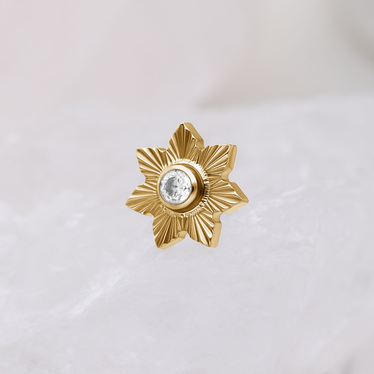 Helpon ja turvallisen push-fit-mekanismin ansiosta koristeosa sopii täydellisesti helix-, lobe-, conch- ja medusa-lävistyksiin. Ajaton, talvesta inspiroitu koru, joka lisää elegantin kukkaisen yksityiskohdan korukokoelmaasi ympäri vuoden.