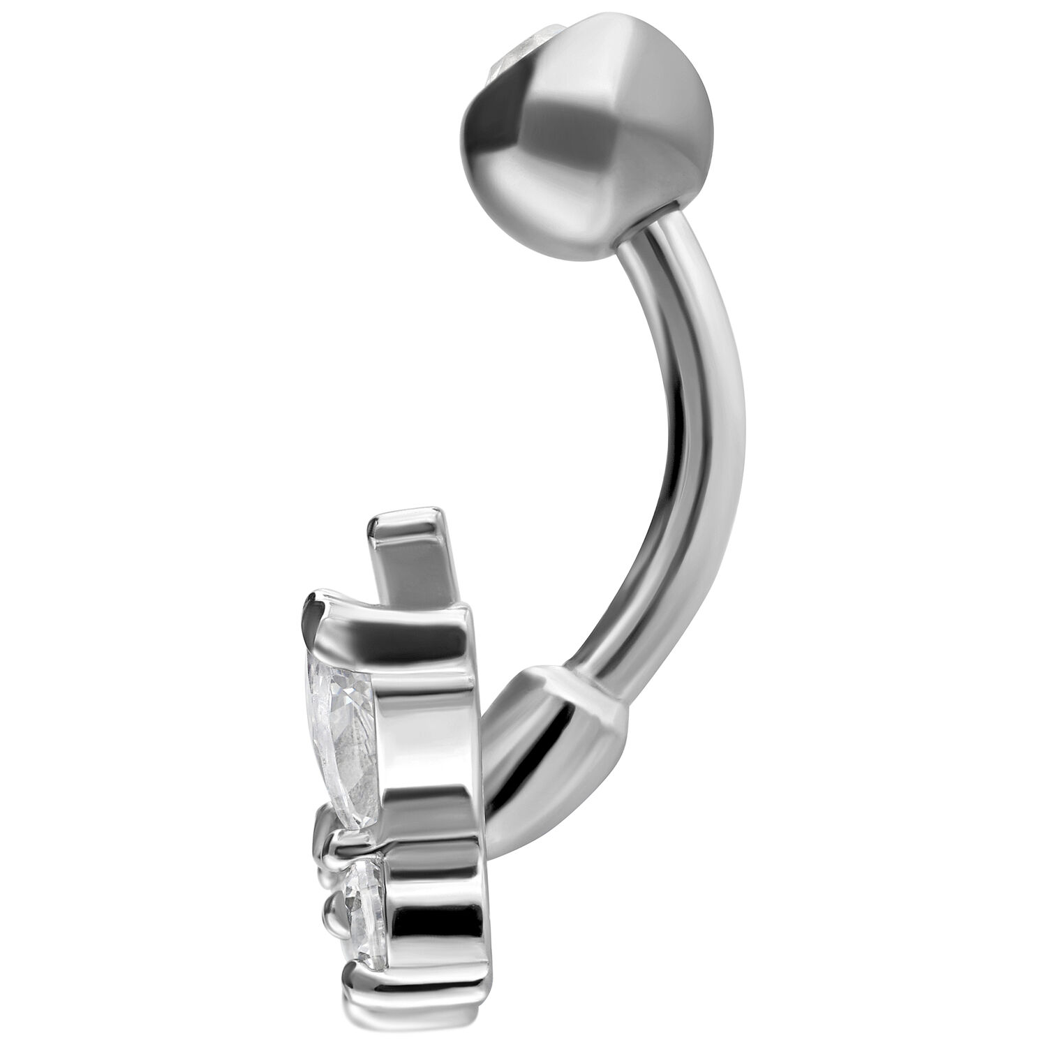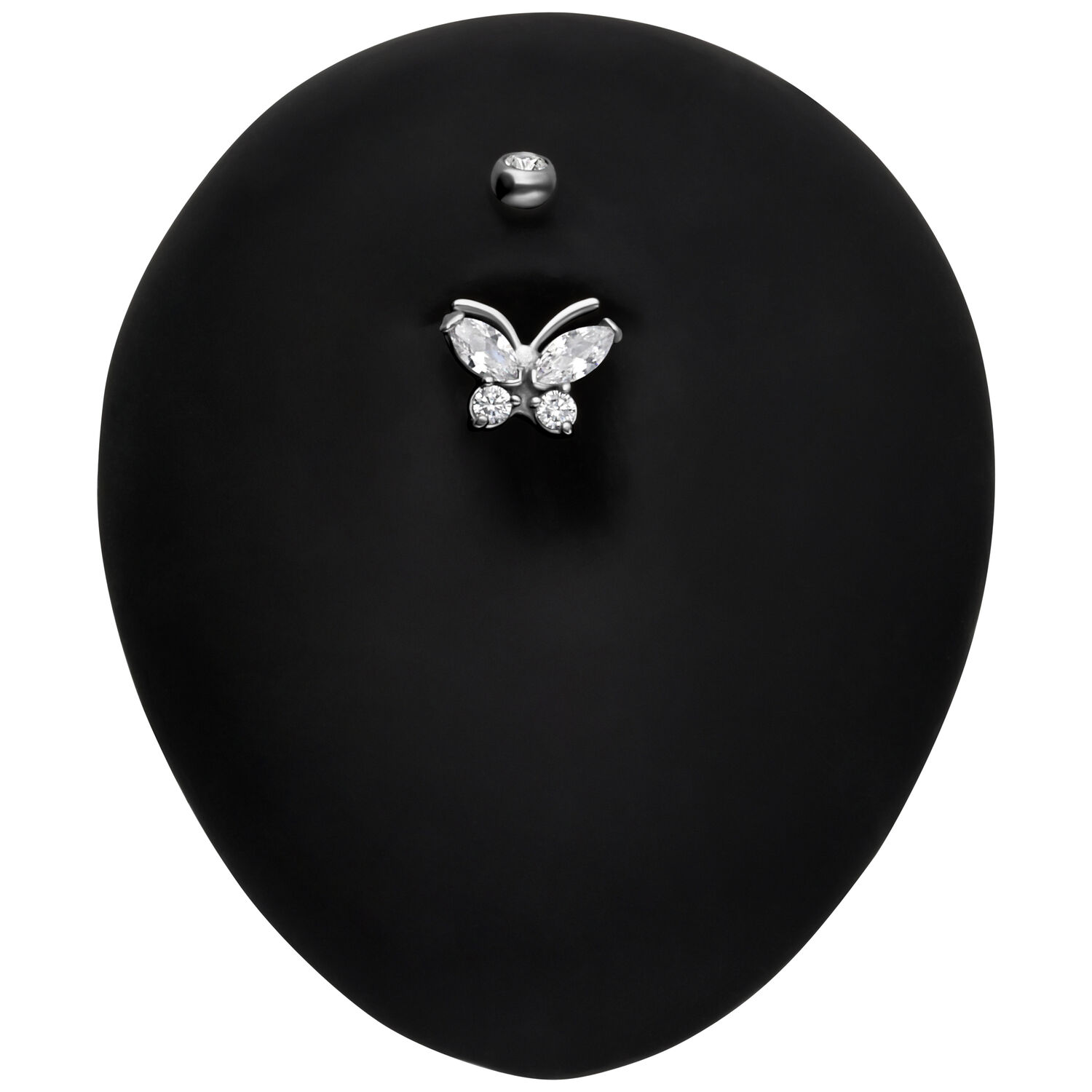 Butterfly Double Jewelled -lävistyskorut ovat saatavana hopeanvärisenä ja kullanvärisenä kirurginteräksenä. Lävistyskorun varressa on ulkokierteet.