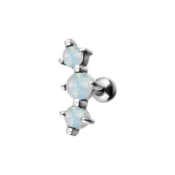 Dieser Ohrbarbell mit drei gefassten synthetischen Opalen bringt dein Ohr so richtig zum funkeln. Das Piercing hat eine Stärke von 1.2 mm und eine Länge von 6.0 mm.