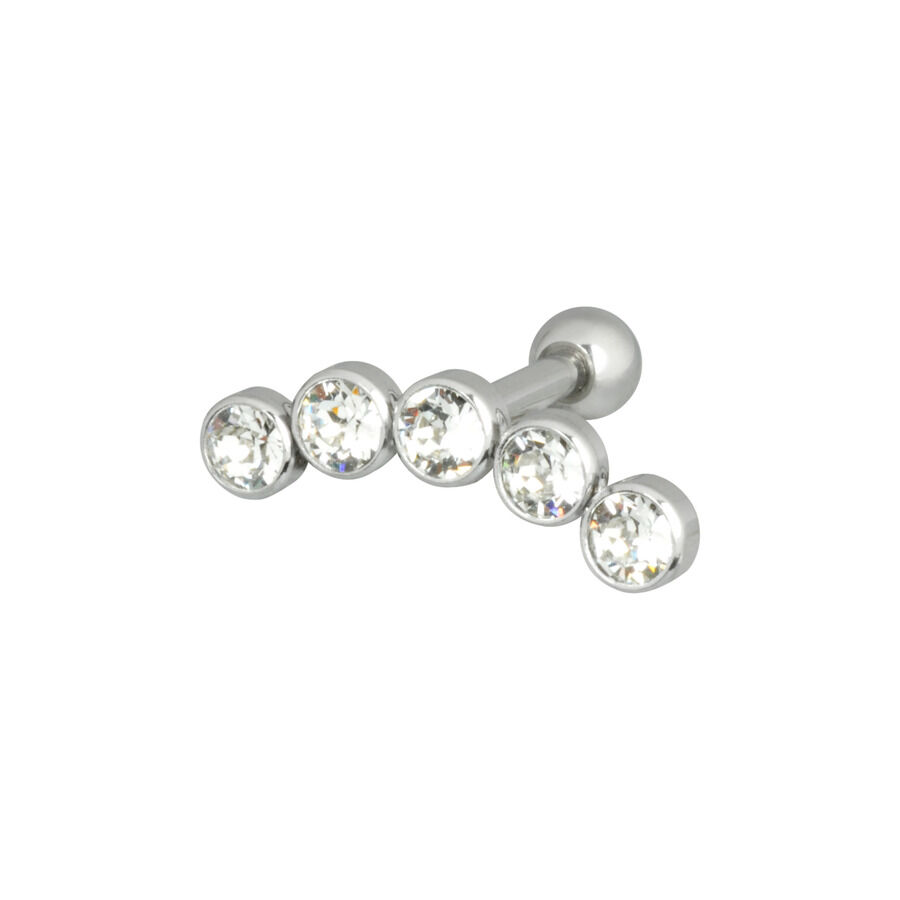 This Steel Basicline® ear stud, whose top is made of stainless steel, has a rod length of 6.0 mm and is especially suitable for your helix or tragus piercing with a stitch channel of 1.2 mm. In this channel, 5 crystals are arranged in an arch next to each other. All basics of the Steel Basicline® are sterilisable.