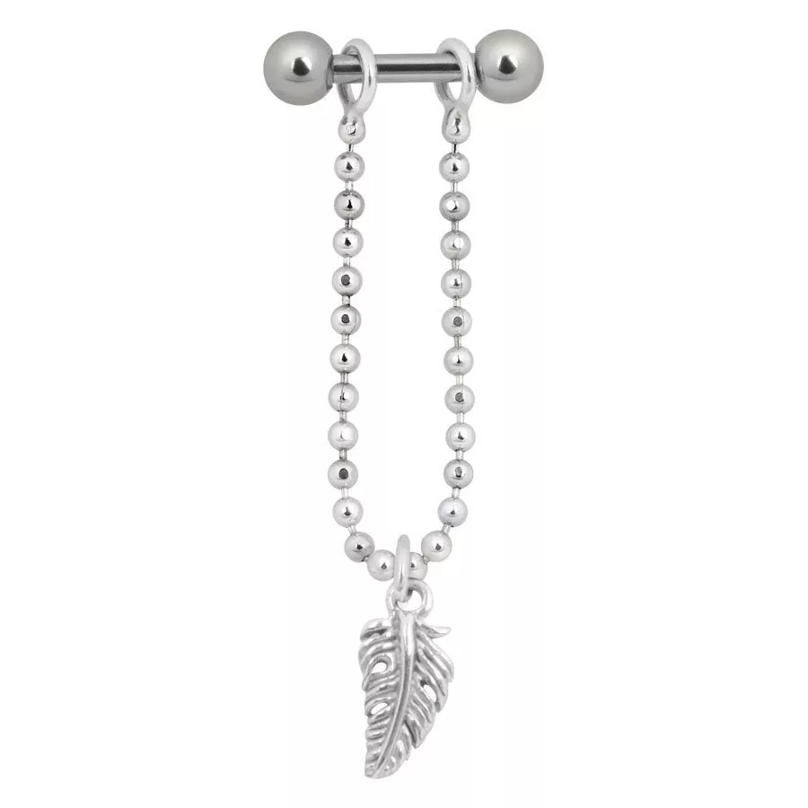 This ear pendant is a cool alternative to ear cuffs for pierced ears. The mini barbell with chain and pendant is perfect for your helix piercing. The bar thickness is 1.2 mm, and the bar length is 6 mm. The balls on both sides are removable.
