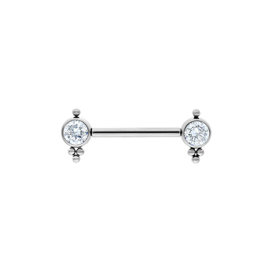 Ein Kristallaufsatz kann an- und abgesteckt werden, was ein super simples Einsetzen ermöglicht. Der Stab kann ganz einfach durch die Brustwarze geschoben und an der anderen Seite verschlossen werden.