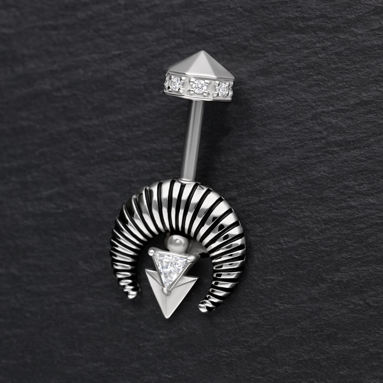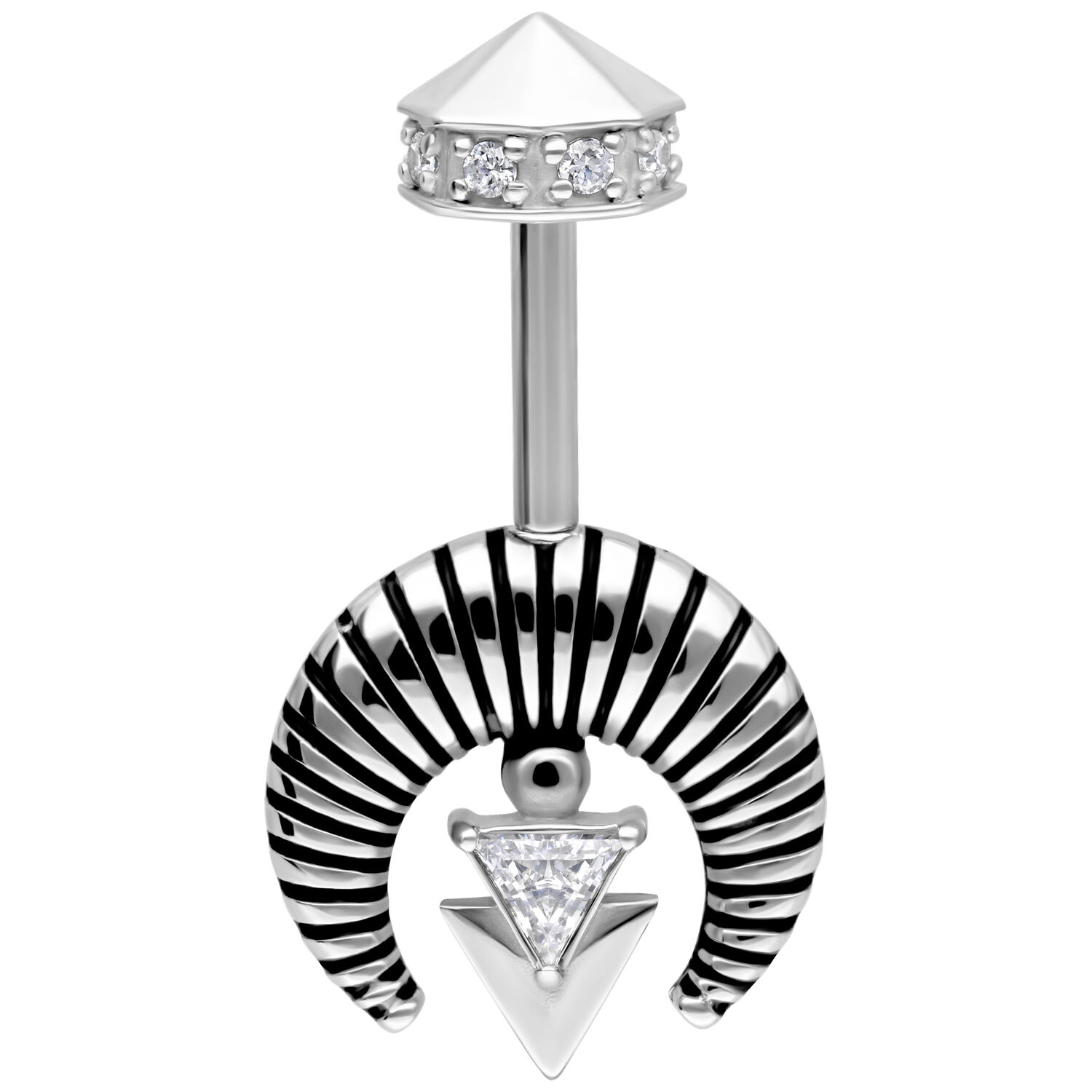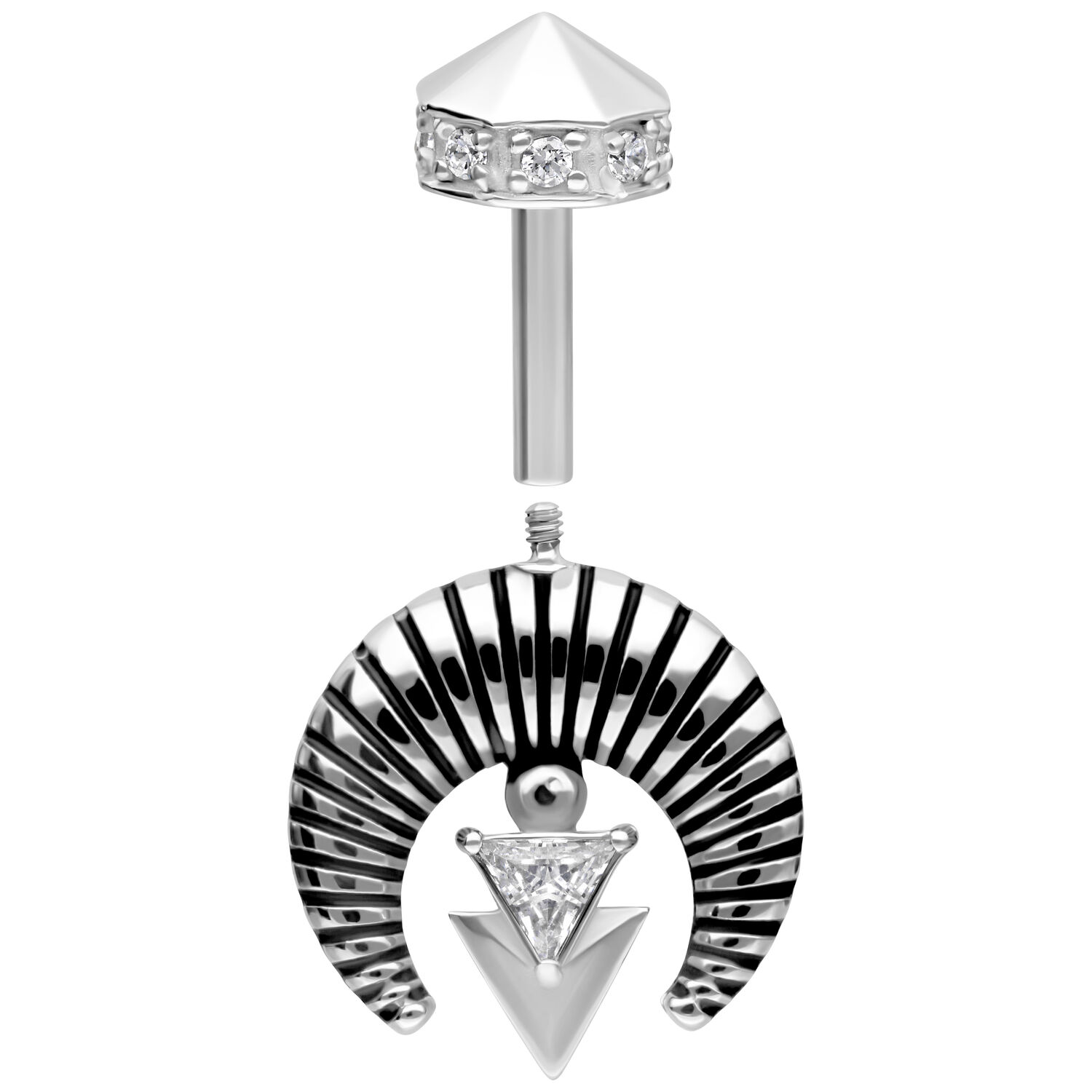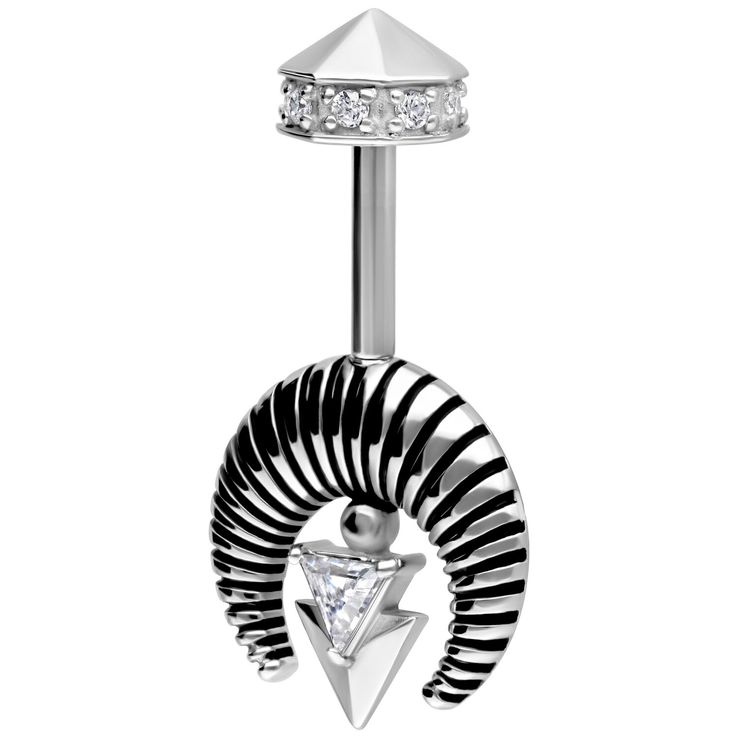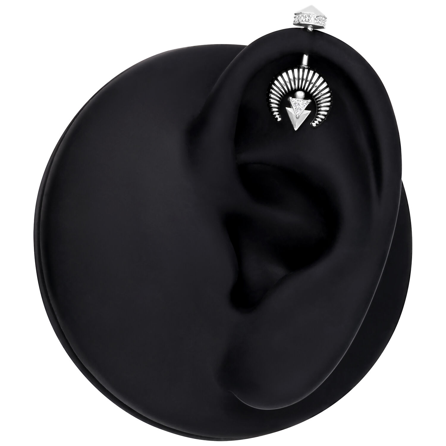 Tämä erityisen näyttävä Vertical Helix -koru tekee vaikutuksen poikkeuksellisella muotoilullaan. Keskellä on kolmion muotoinen zirkoniakivi, jota ympäröi silmiinpistävä, uritettu puoliympyräelementti. Kokonaisuutta täydentää geometrinen, alaspäin osoittava nuoli – tyylikäs ja vahva lisä. Yläosan sisäkierteellä varustettu koristeosa on fasetoitu ja koristeltu pienillä zirkonakivillä – hienostunut lisä kaikille, jotka rakastavat näyttäviä yksityiskohtia.