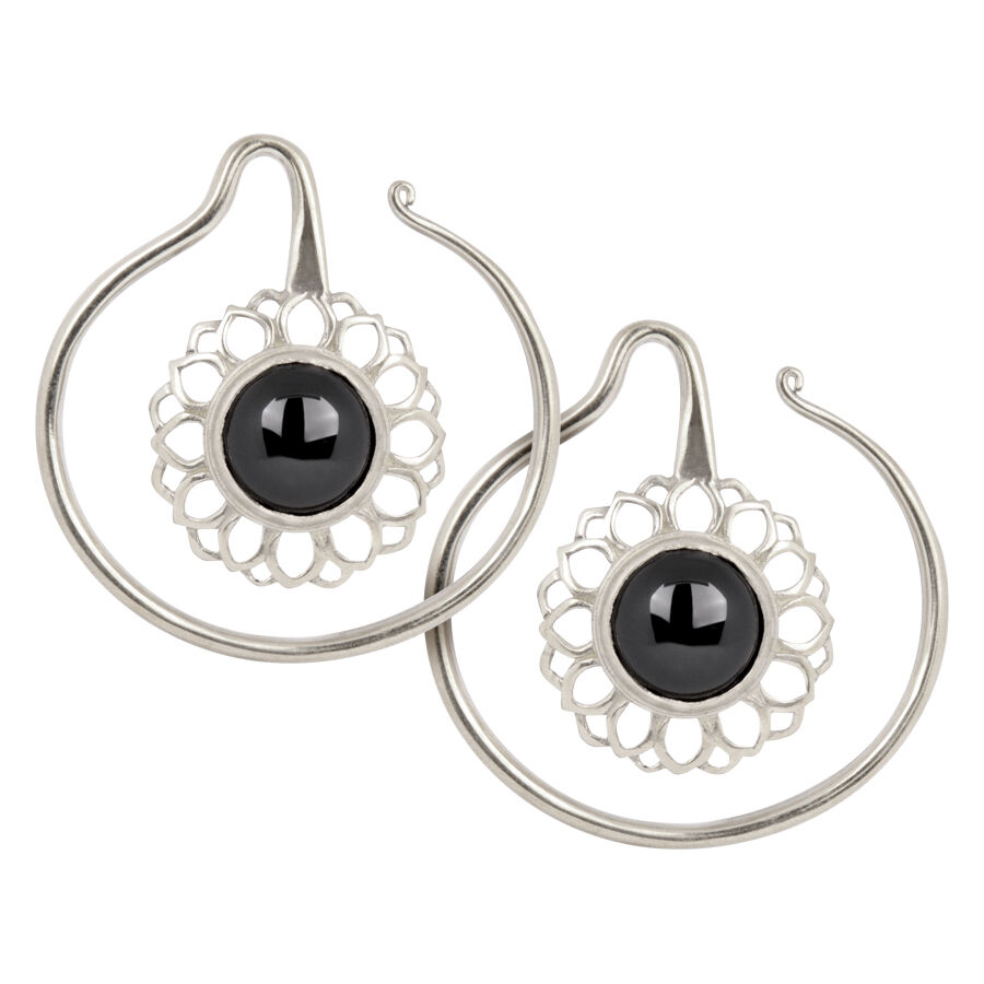 Onyx-tyylisellä kivellä varustetut Whirl-korvapainomme ovat tyylikkäästi käsiteltyjä. Pieni kukkaympyrä ympäröi kiven.