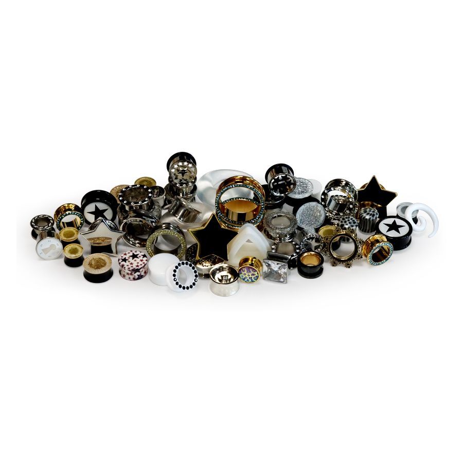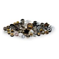 Do you like stretched ears and crazy designs? Then this set is just the thing for you. The ‘Winter Wonderland Set’ consists of 56 plugs, tunnels and stretching tools made of various materials, such as stainless steel, acrylic, silicone, wood, stone, titanium and PMMA. The sizes are wildly mixed so that there is something for everyone. It contains pairs as well as seperate parts. The set is also ideal for your shop window or showcase, as the colours blend beautifully.