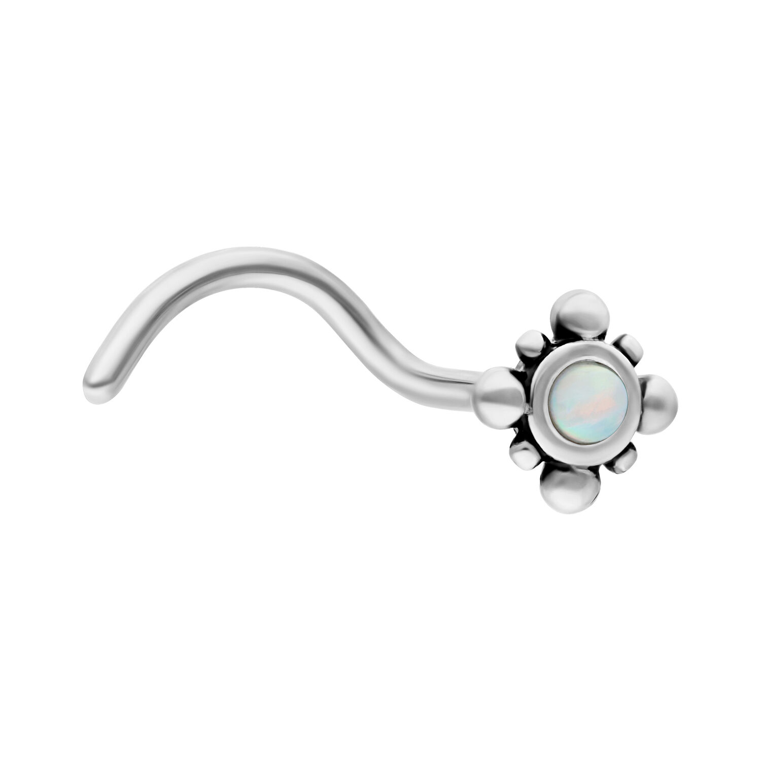 Opal bedeutet so viel wie “Stein der wechselnden Farbe”, das bringt auch dieser Nasenstecker zum Ausdruck. Der Stab des Nasensteckers hat eine Stärke von 0.8 mm und eine Länge von 6.5 mm. Das Zentrum der Blüte ist mit einem wunderschönen, synthetischen Opal geschmückt.