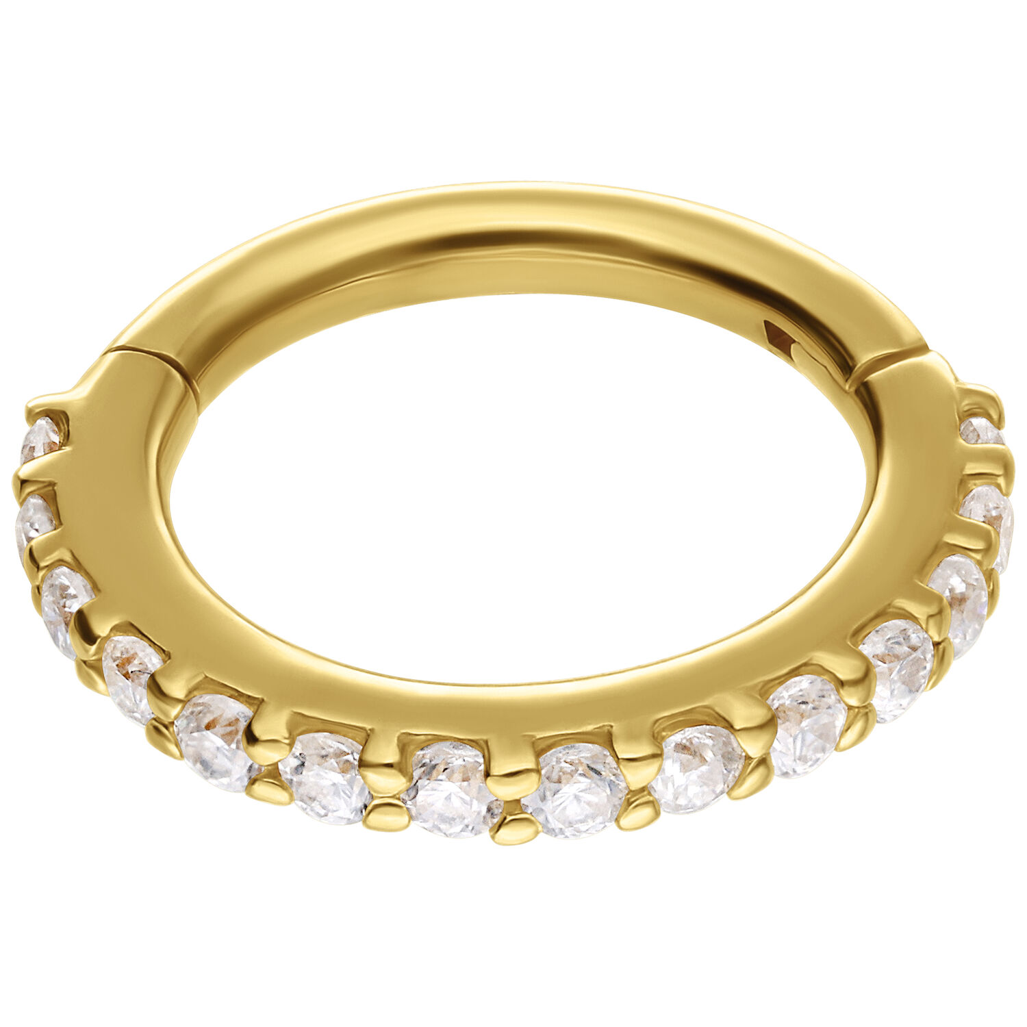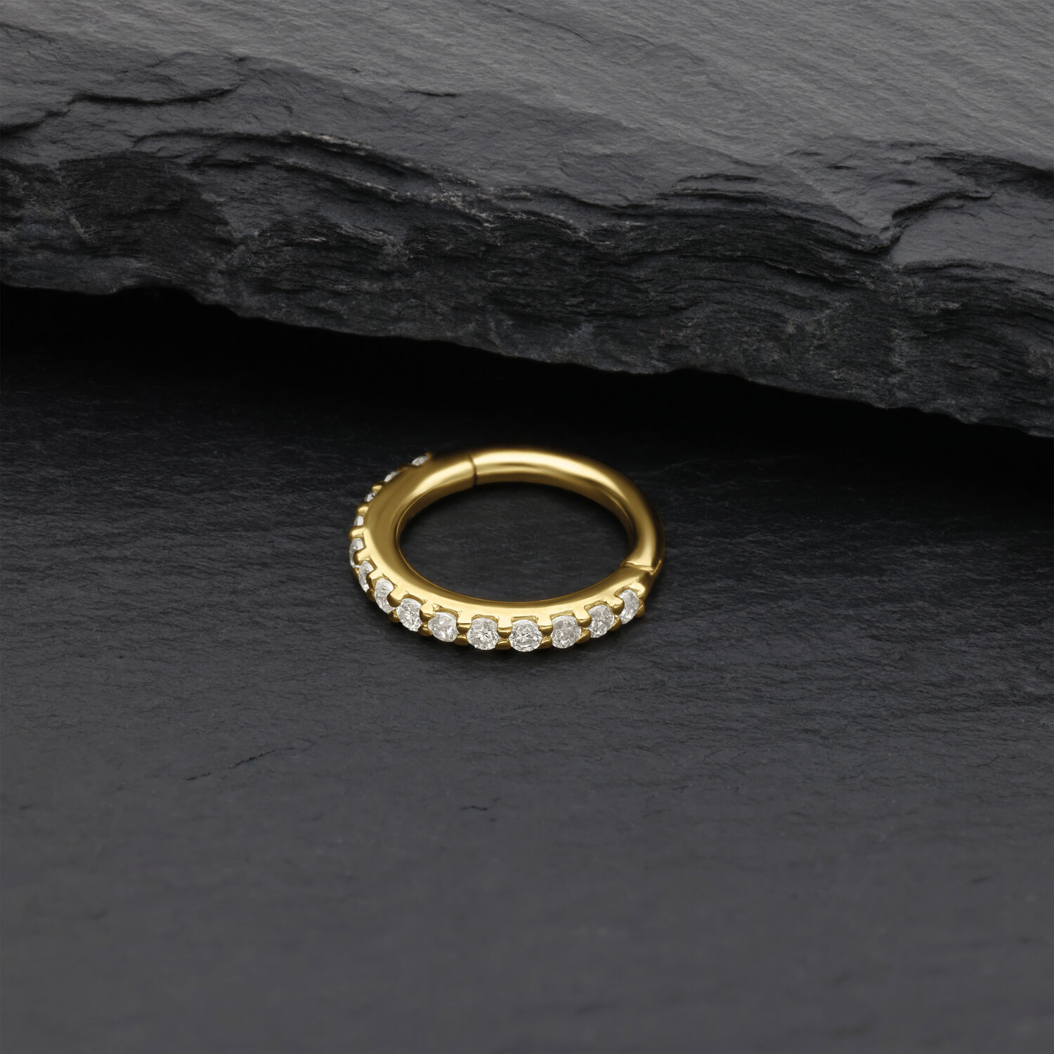 The smooth hinge closure allows for effortless, secure insertion. With a 1.0 mm thickness, this ring is especially well-suited for nostril piercings, while also being wearable in other thinner piercing placements.