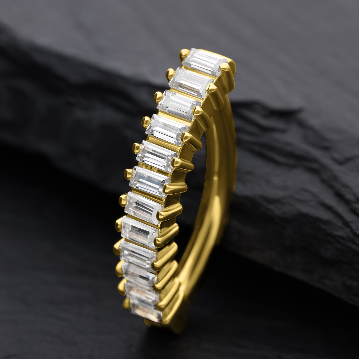 18K Moissanit Baguette Crystal Belly Arch Clicker on ihanteellinen valinta kaikille, jotka arvostavat ylellisiä lävistyskoruja, ensiluokkaista laatua ja mukavuutta.