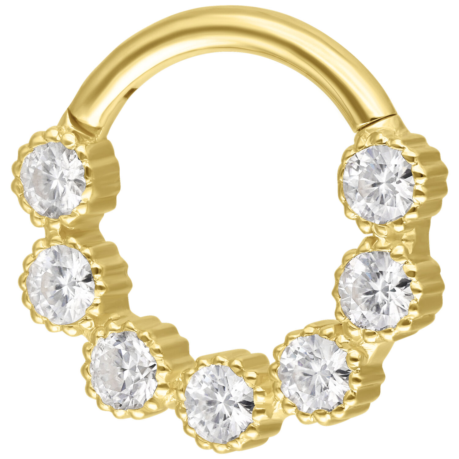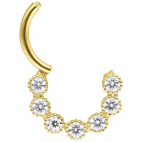 The 18K Rounded Moissanite Crystal Ring embodies pure elegance and brilliant craftsmanship. Made from solid 18-karat gold and adorned with round-cut Moissanite crystals, this clicker adds a sophisticated sparkle to any piercing.