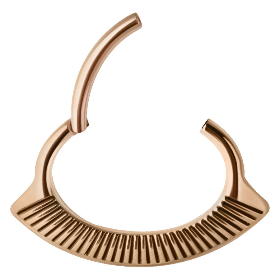 Our Crest Septum Piercing has a unique design and is super suitable for everyday wear! It is made of rose-coloured stainless steel and offers easy handling during insertion and removal due to its hinged clasp. The piercing can also be worn on the ear or on the lip band (smiley).