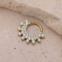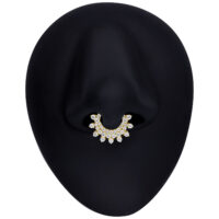 Divine Crystal Septum Clicker -lävistyskoru on todellinen katseenvangitsija niille, jotka rakastavat rohkeita lävistyskoruja. Clickerissä on runsaasti kirkkaita, kimaltelevia kristalleja, jotka tarjoavat maksimaalista loistetta ja ylellisen, huomion herättävän ilmeen. Loistelias ulkonäkö lisää glamouria mihin tahansa lävistykseen.