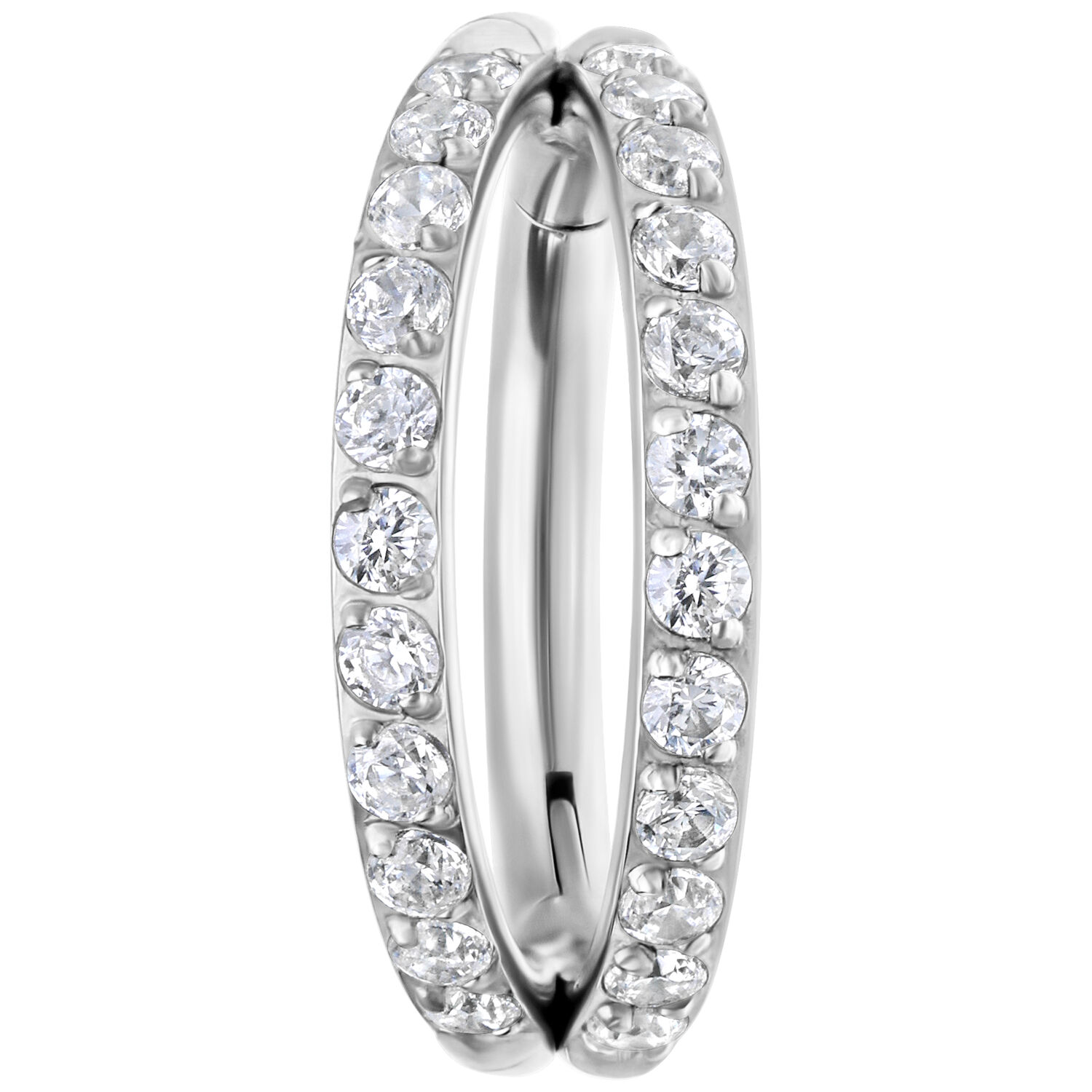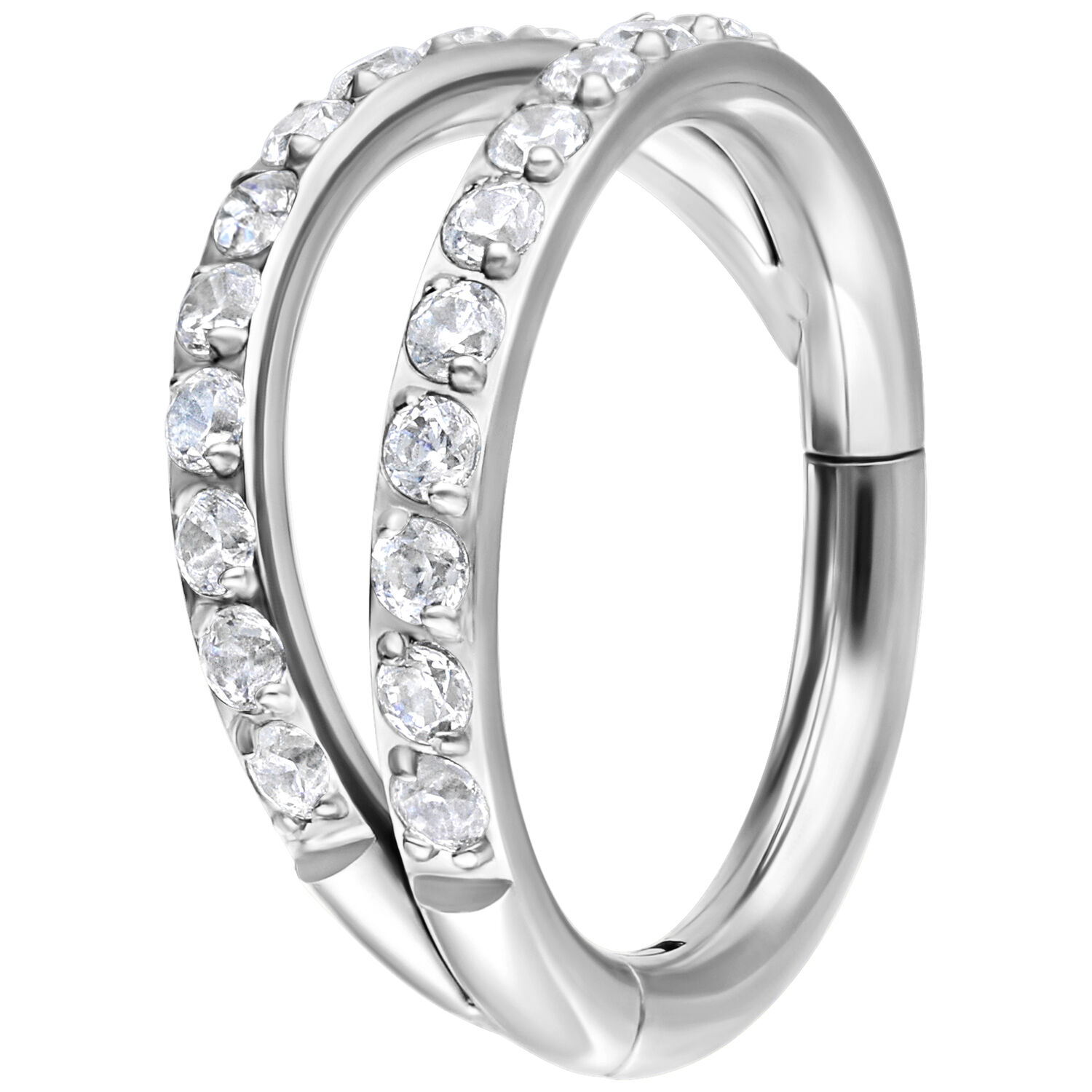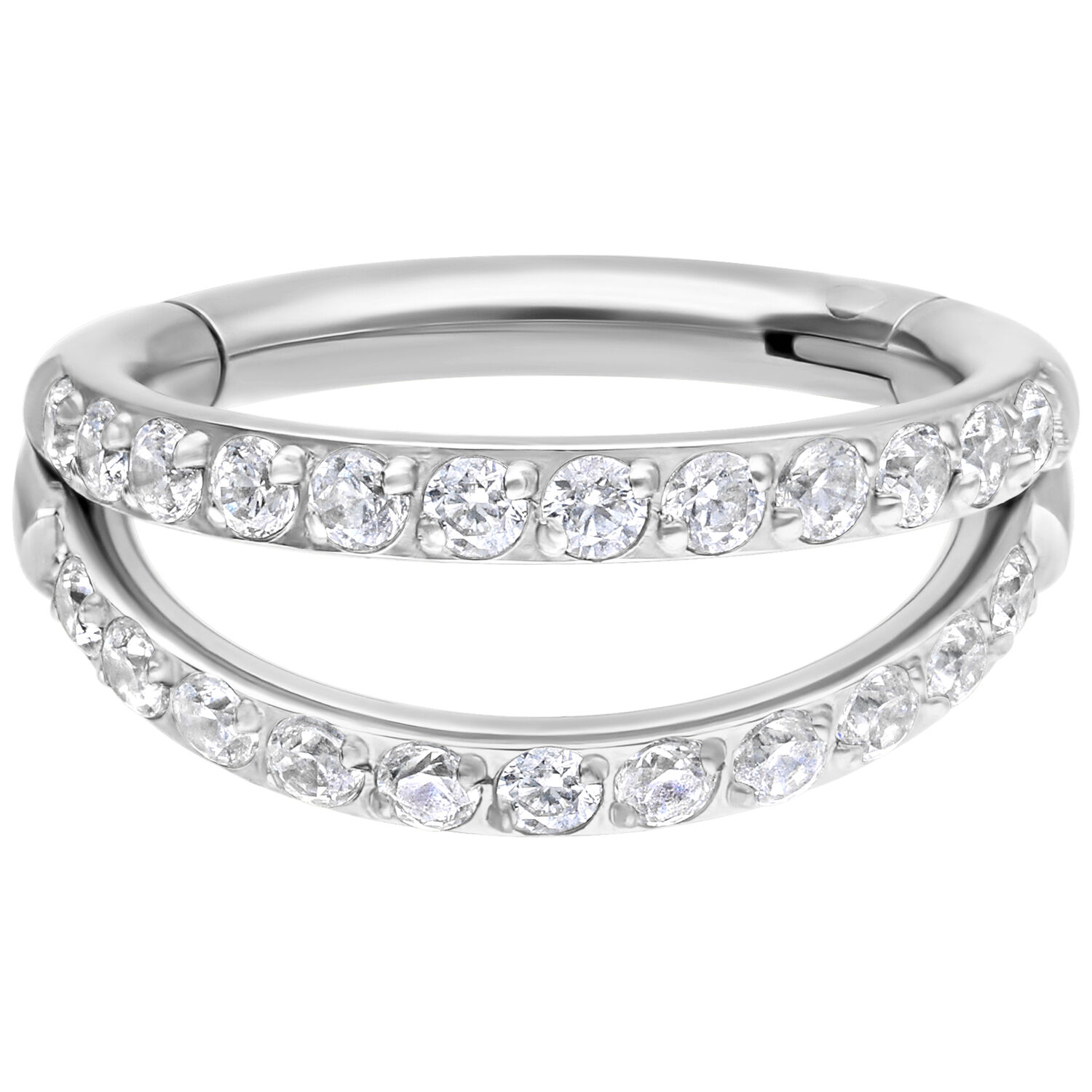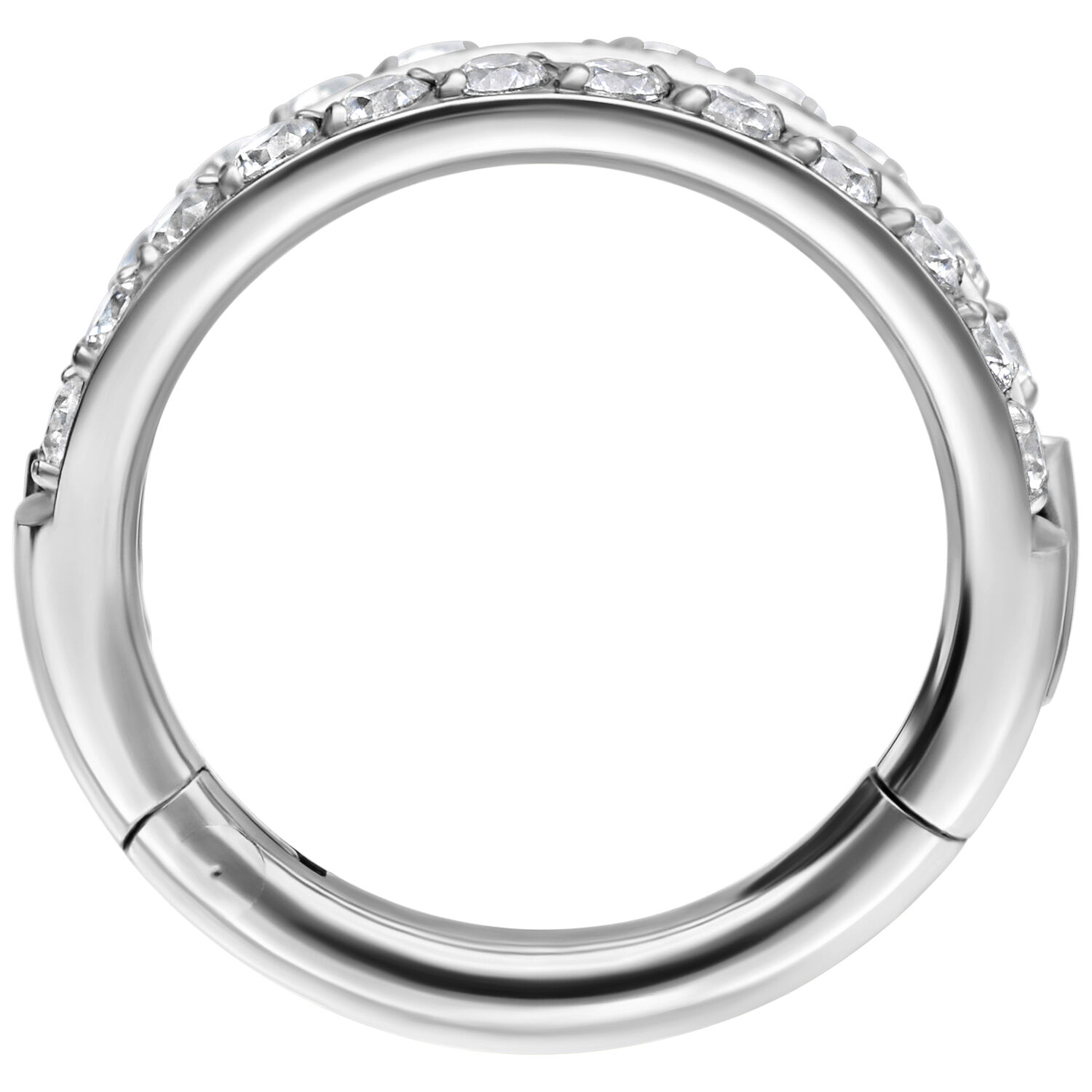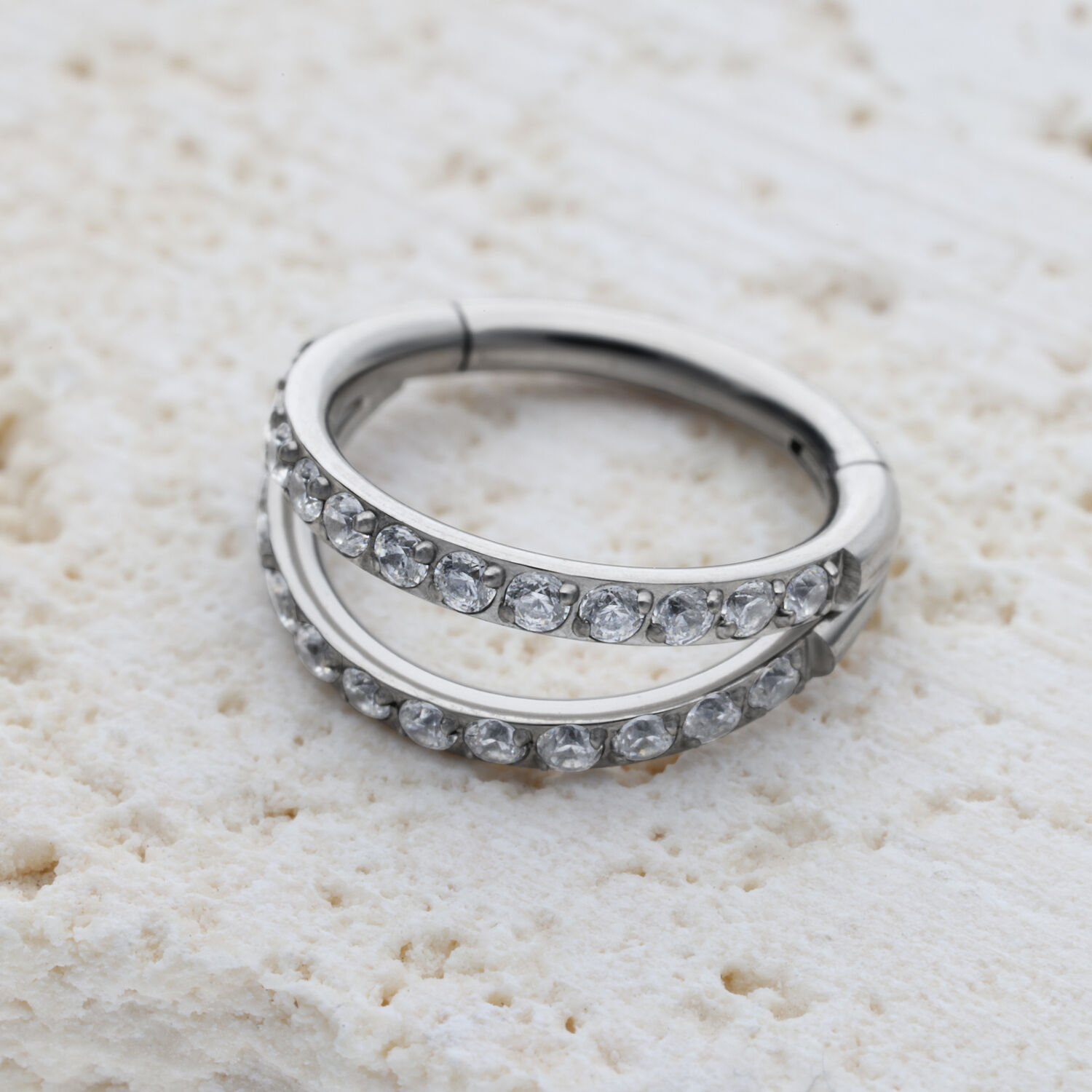 Laadukas saranallinen clicker-rengas, jossa katse kiinnittyy välittömästi kahteen asiaan – lukemattomiin, välkehtiviin kristalleihin ja kahteen, erilliseen, eleganttiin rengaskaareen.