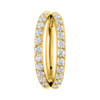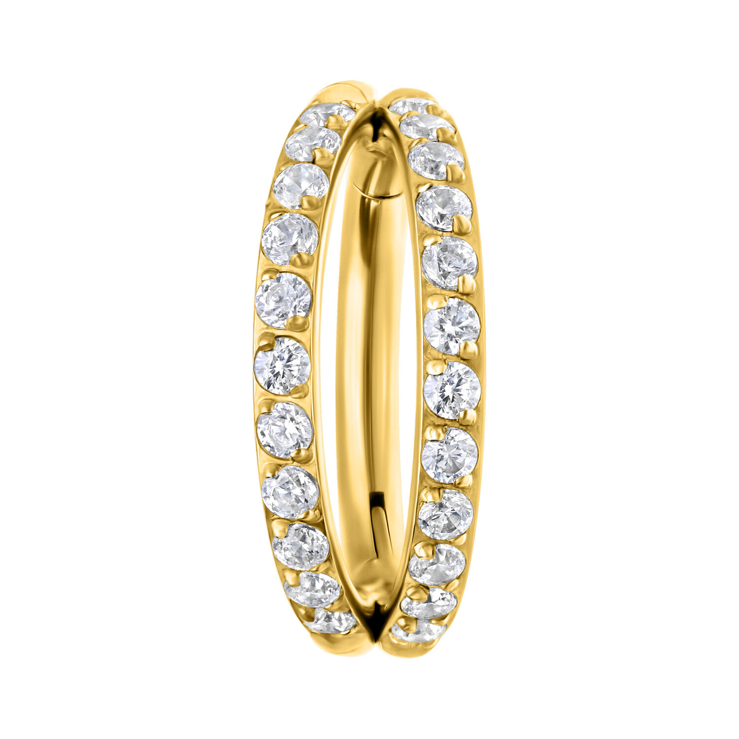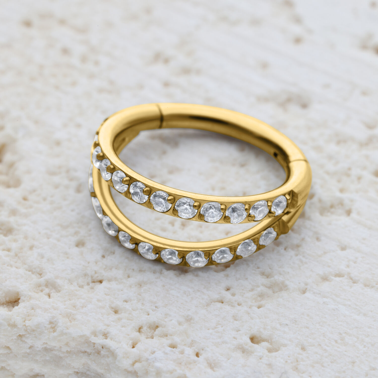 Laadukas saranallinen clicker-rengas, jossa katse kiinnittyy välittömästi kahteen asiaan – lukemattomiin, välkehtiviin kristalleihin ja kahteen, erilliseen, eleganttiin rengaskaareen.