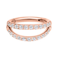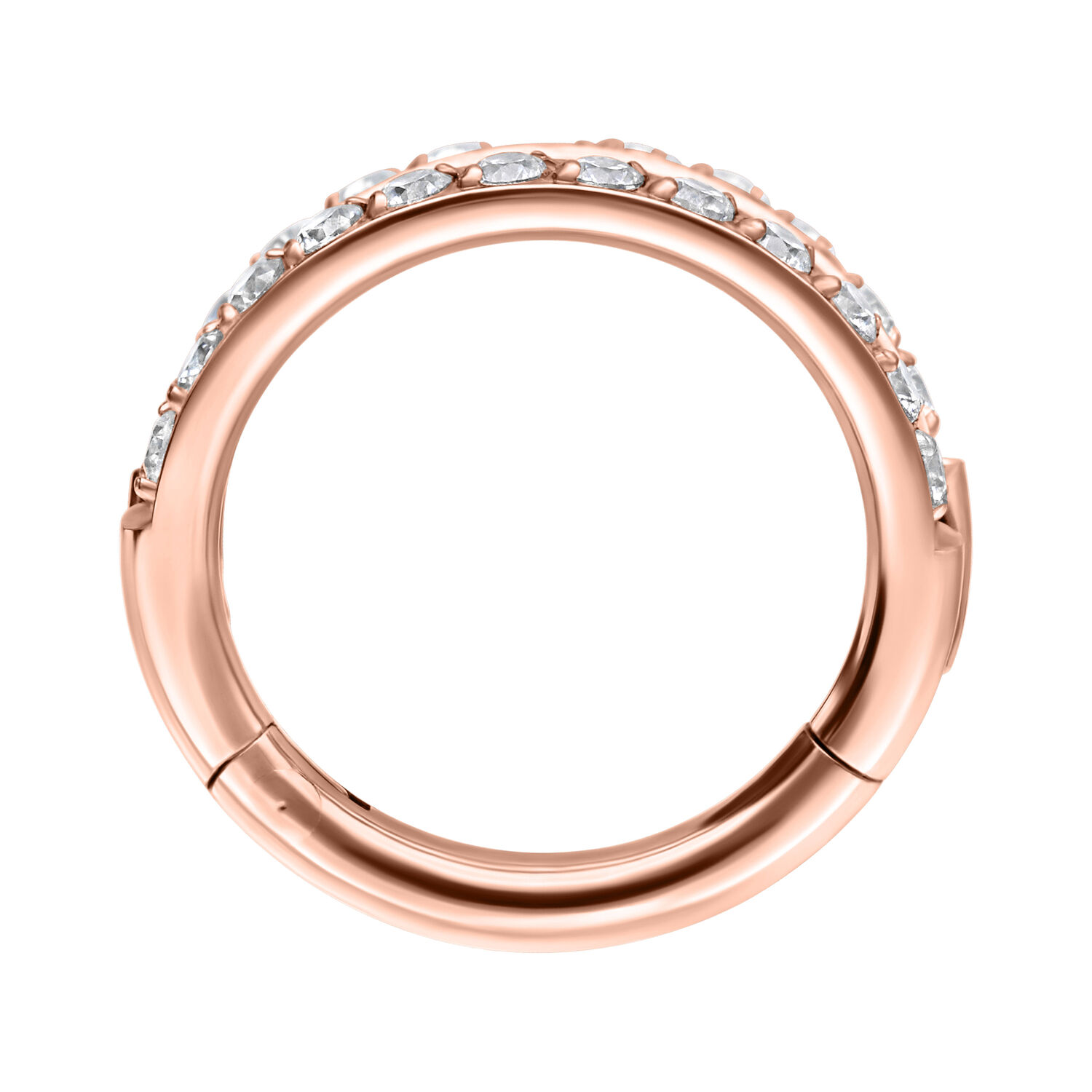 Laadukas saranallinen clicker-rengas, jossa katse kiinnittyy välittömästi kahteen asiaan – lukemattomiin, välkehtiviin kristalleihin ja kahteen, erilliseen, eleganttiin rengaskaareen.