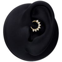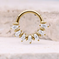 Marquise Sunburst Septum Clicker -lävistyskorussa on elegantti auringonsäteitä muistuttava muotoilu, jossa kristallinkirkkaat marquise-hiotut kivet on aseteltu täydelliseen symmetriaan. Hienostunut säihke luo ylellisen mutta modernin ilmeen, joka korostaa lävistystä kauniisti.