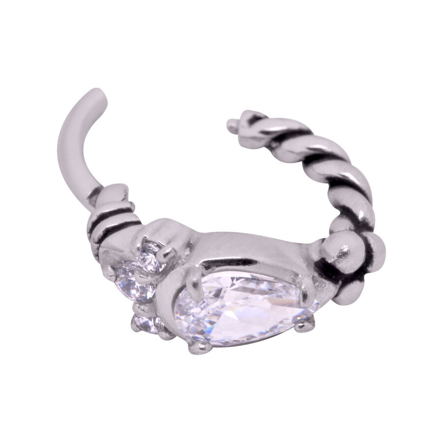 Dieser hochwertige Schanierring fällt besonders durch seine drei kleinen Zirkonia Kristalle und dem besonderen Tropfenförmigen Zirkonia auf, die dich bereits aus der Ferne zum Strahlen bringen. Lass deiner Kreativität freien Lauf, denn du kannst diesen Ring so gut wie für jedes Piercing am Ohr benutzen. Besonders geeignet ist er für dein Helixpiercing. Auf Grund seines aufklappbaren Verschlusses ist es super einfach dein Piercing ohne Hilfe auszutauschen.