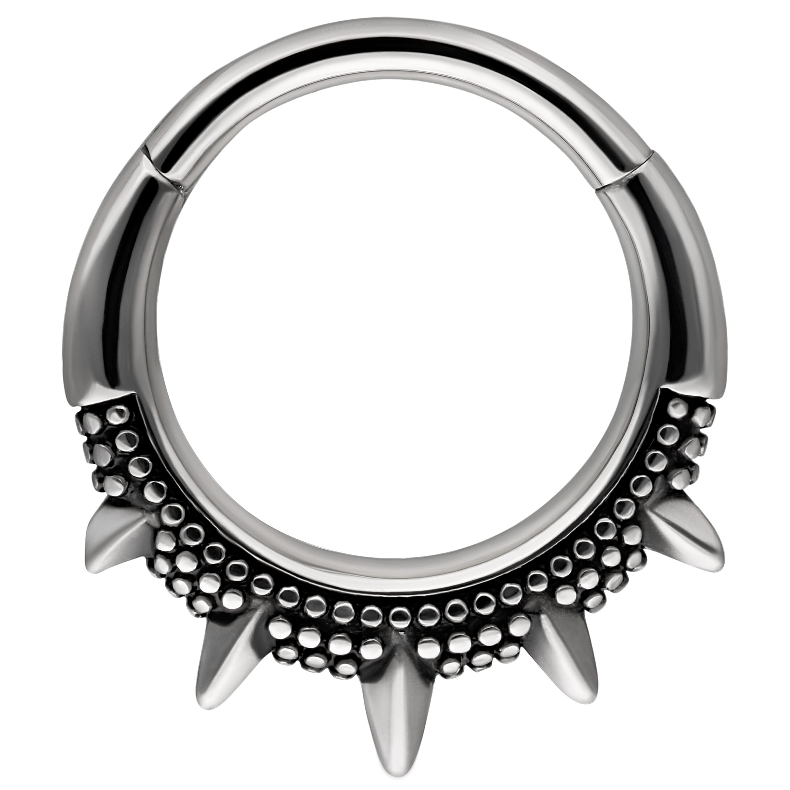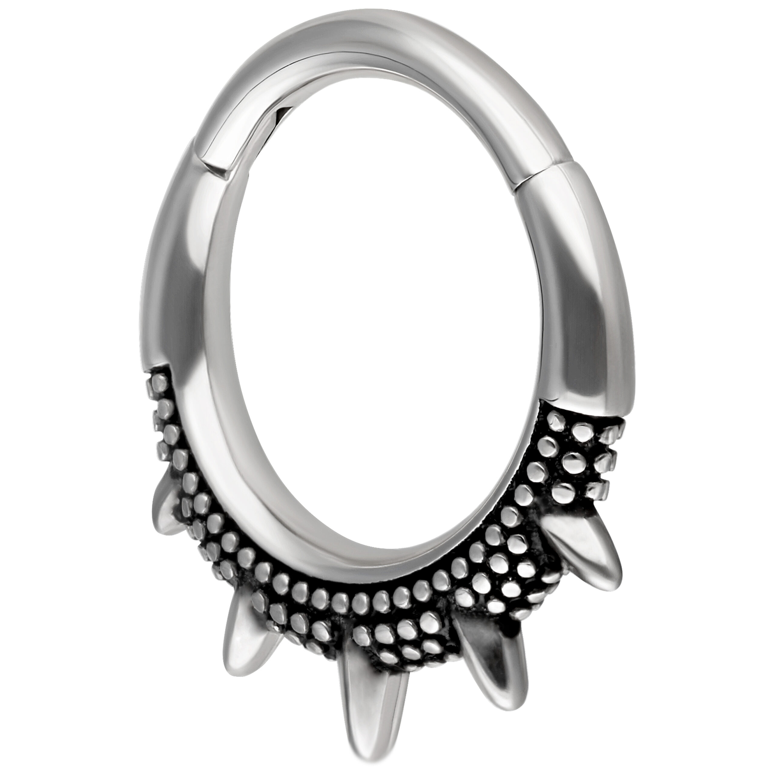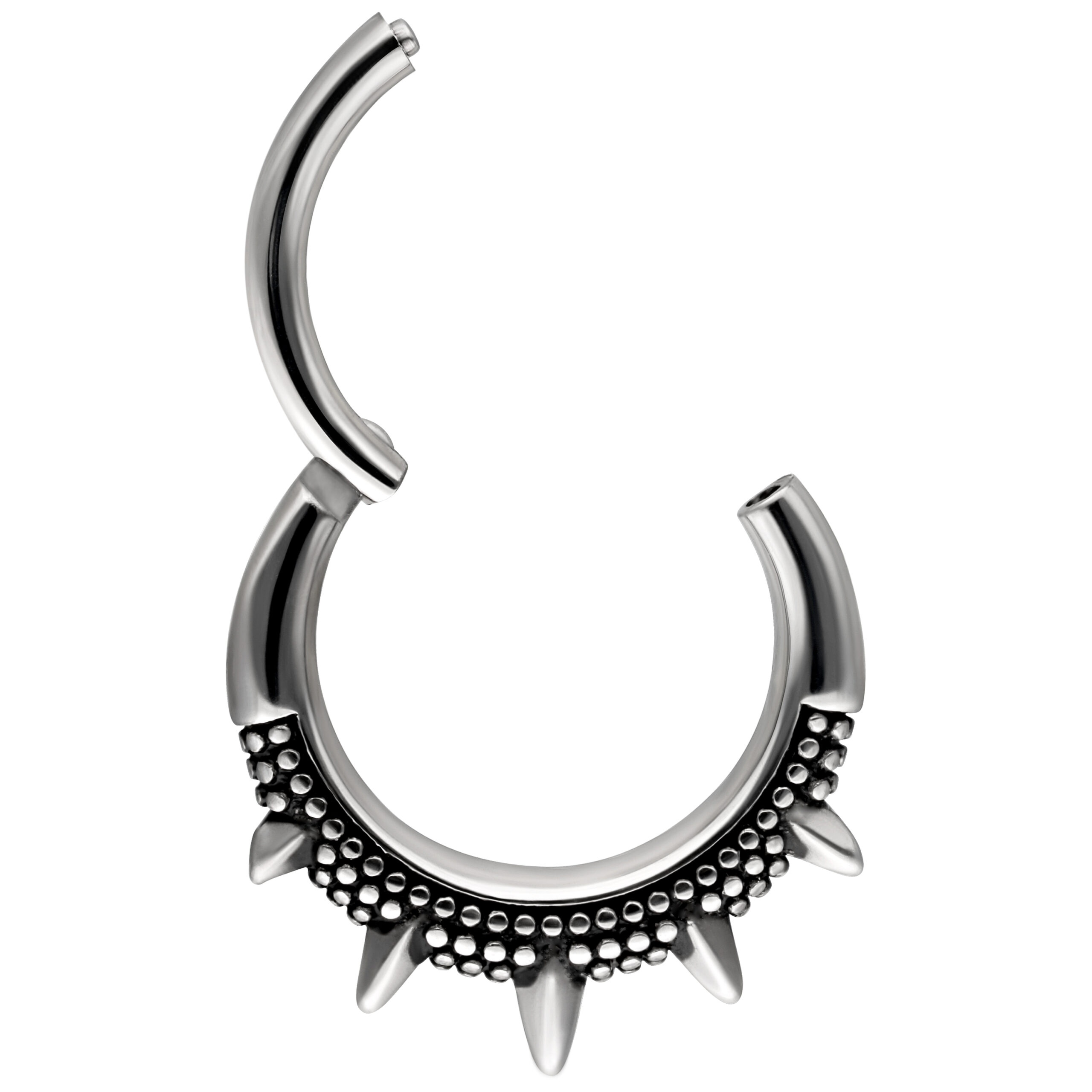 Oriental Spiked Clicker-renkaat on valmistettu korkealaatuisesta ruostumattomasta teräksestä ja ne sopivat erinomaisesti septum- tai daith-lävistykseesi. Lävistykorussa on kaareva saranatanko, jonka avulla voit helposti laittaa lävistyksen paikalleen, myös ilman apua.