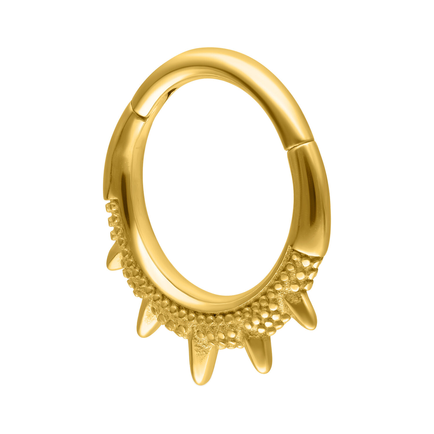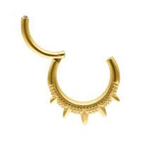 Oriental Spiked Clicker-renkaat on valmistettu korkealaatuisesta ruostumattomasta teräksestä ja ne sopivat erinomaisesti septum- tai daith-lävistykseesi. Lävistykorussa on kaareva saranatanko, jonka avulla voit helposti laittaa lävistyksen paikalleen, myös ilman apua.