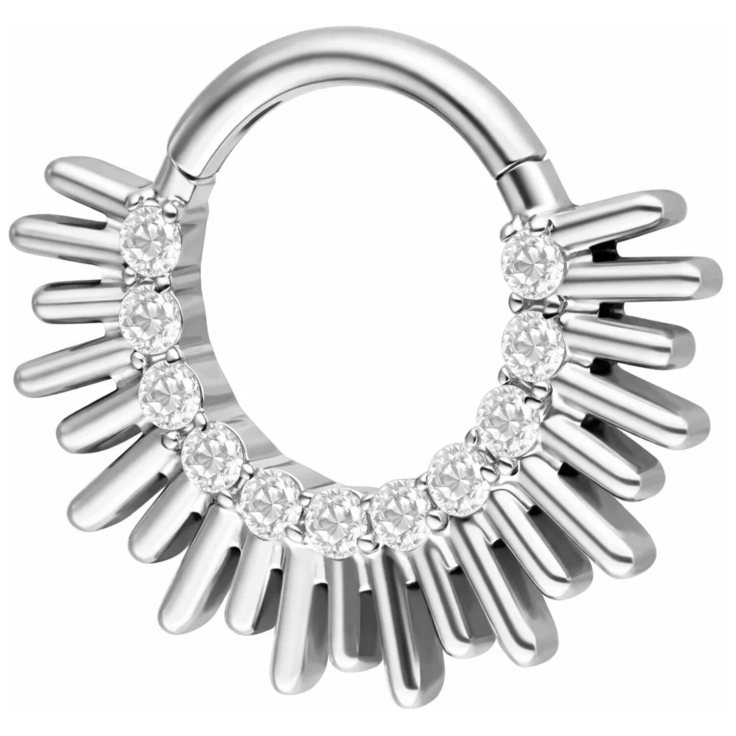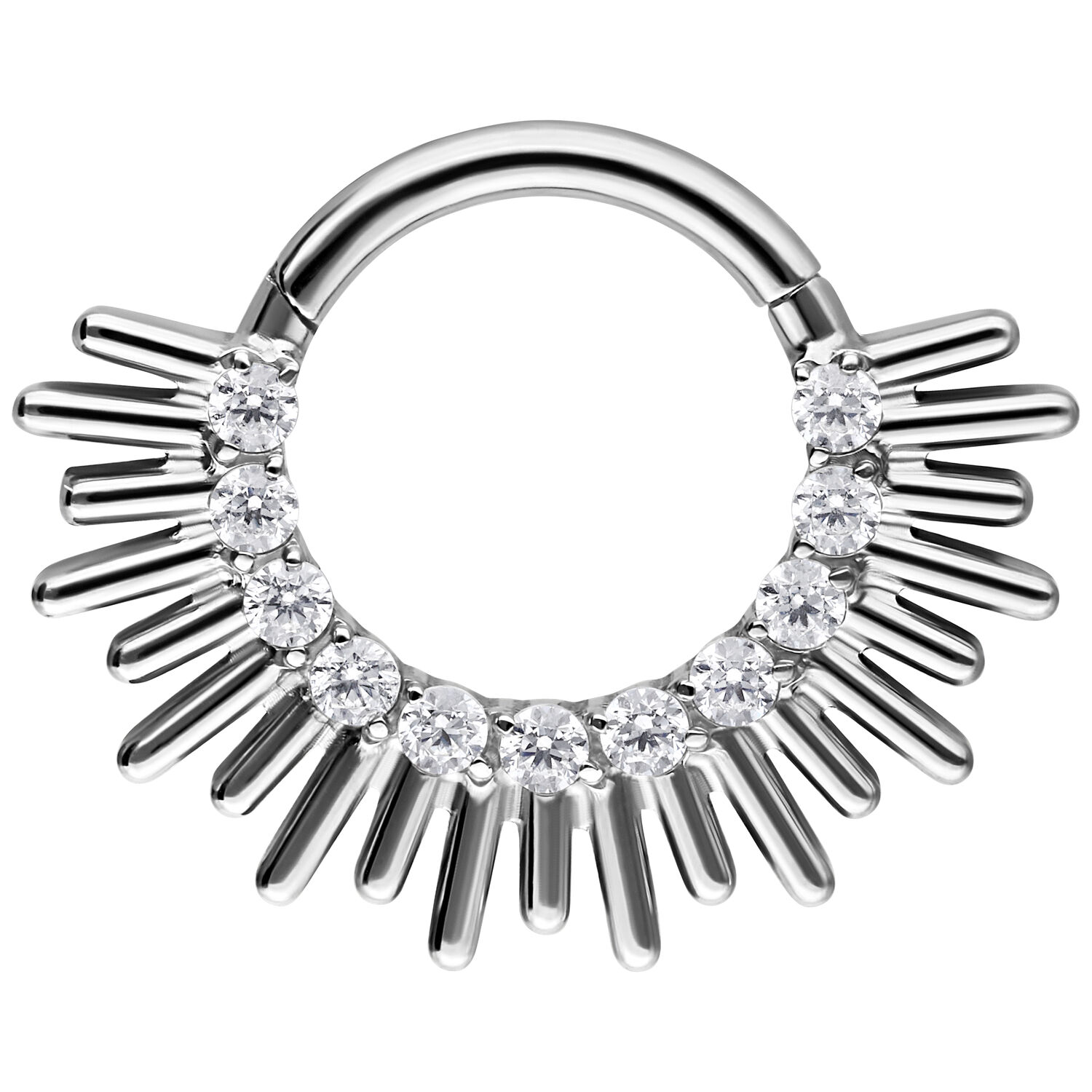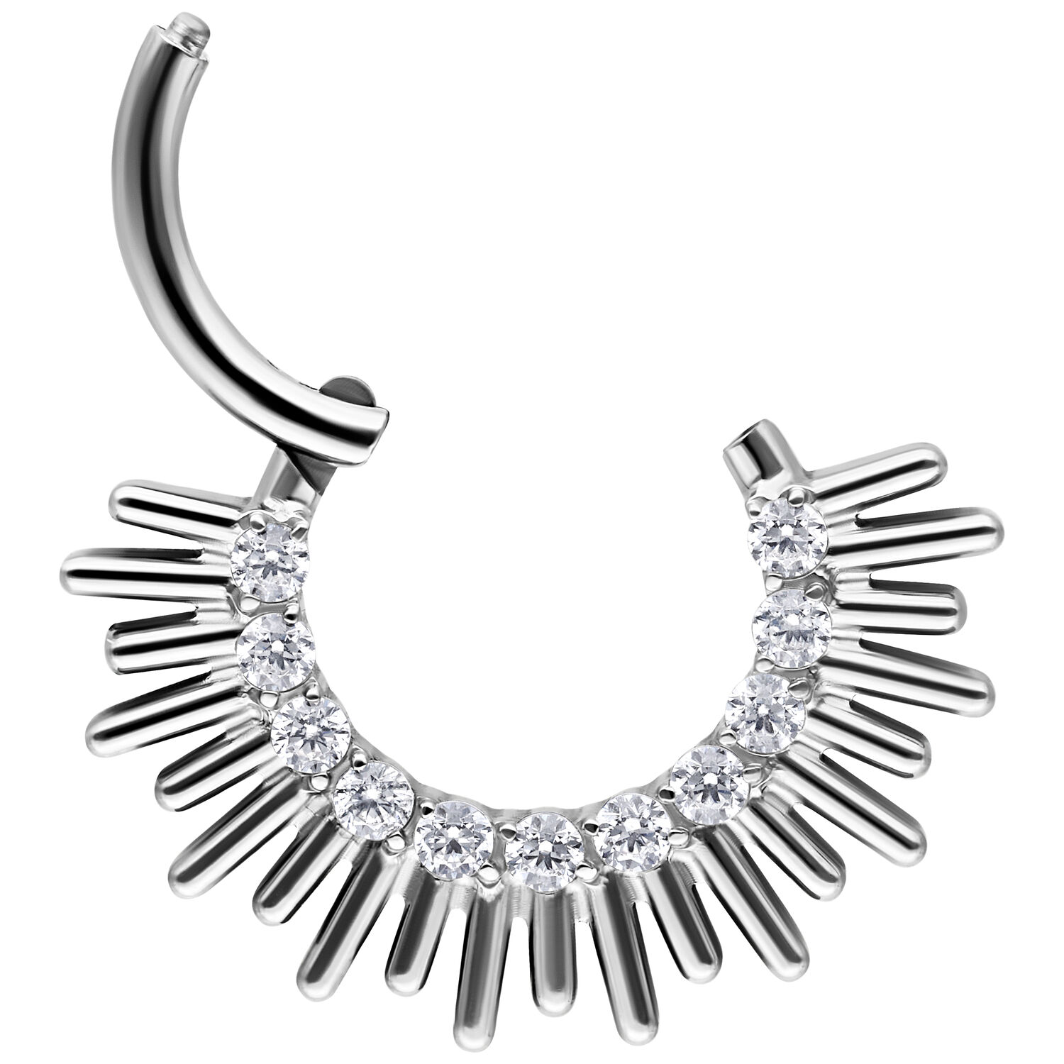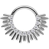 The Sun Beams septum & daith clicker made from titanium grade 23 represents expressive design with a clean, structured aesthetic. Finely arranged, sun-beam inspired elements create a powerful yet elegant appearance. The striking design makes a confident statement – modern, bold, and perfectly balanced.