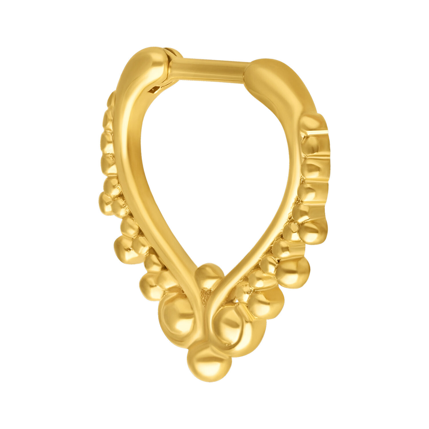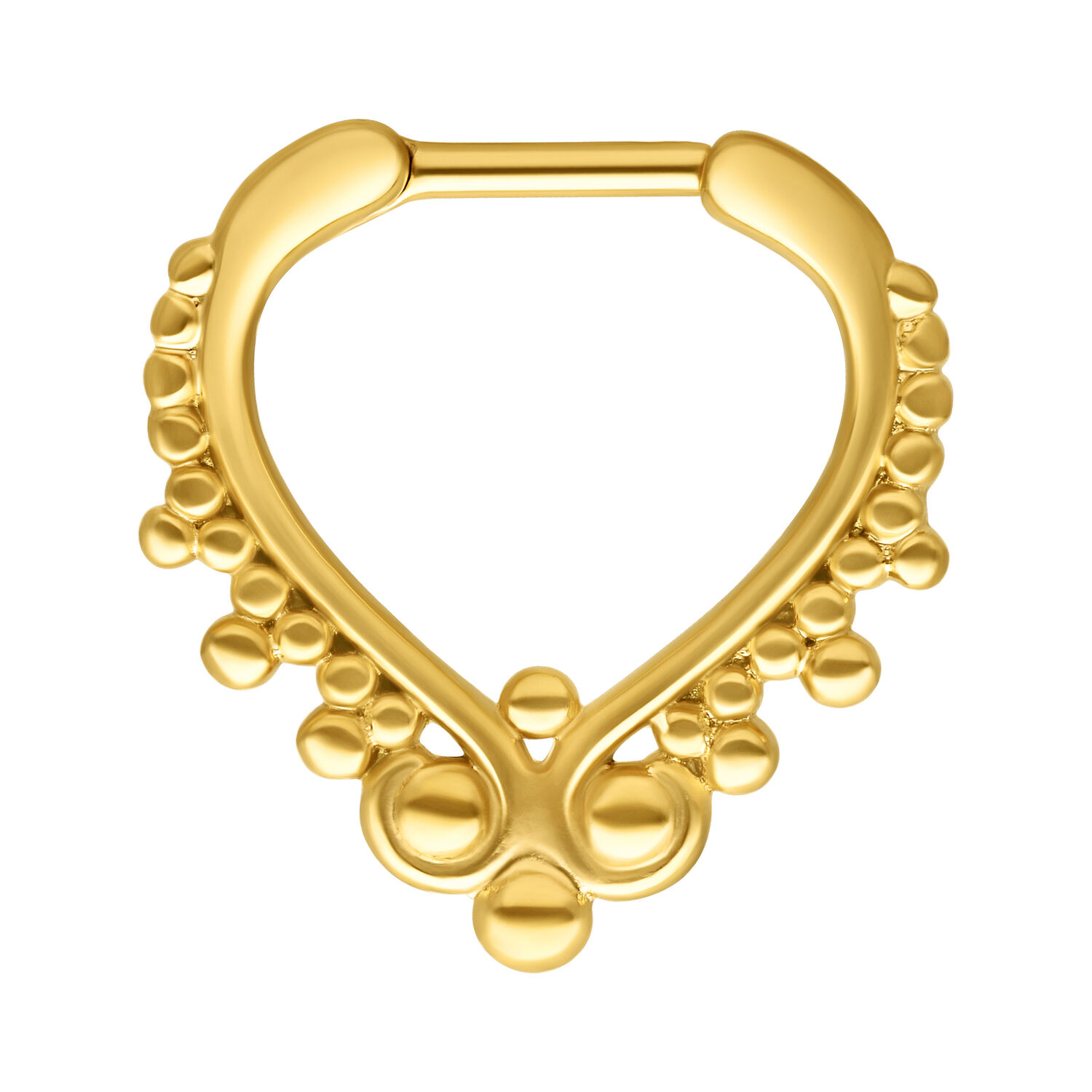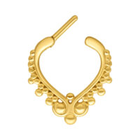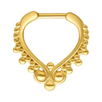 Unser Wonderland Septum Clicker besitzt ein traumhaft schönes und einzigartiges Design. Das Piercing hat einen kleinen Hauch vom Orient, und dazu macht die goldene Farbe ihn zum absoluten Hingucker! Das Septum-Piercing besitzt einen geraden Scharnier-Stahlsteg aus Edelstahl mit einer Länge von ca. 6.0 mm. Durch seinen Klick-Verschluss ist das Piercing super leicht zu öffnen und einzusetzen. Alternativ kann das Piercing auch zum Beispiel für dein Daith Piercing verwendet werden.