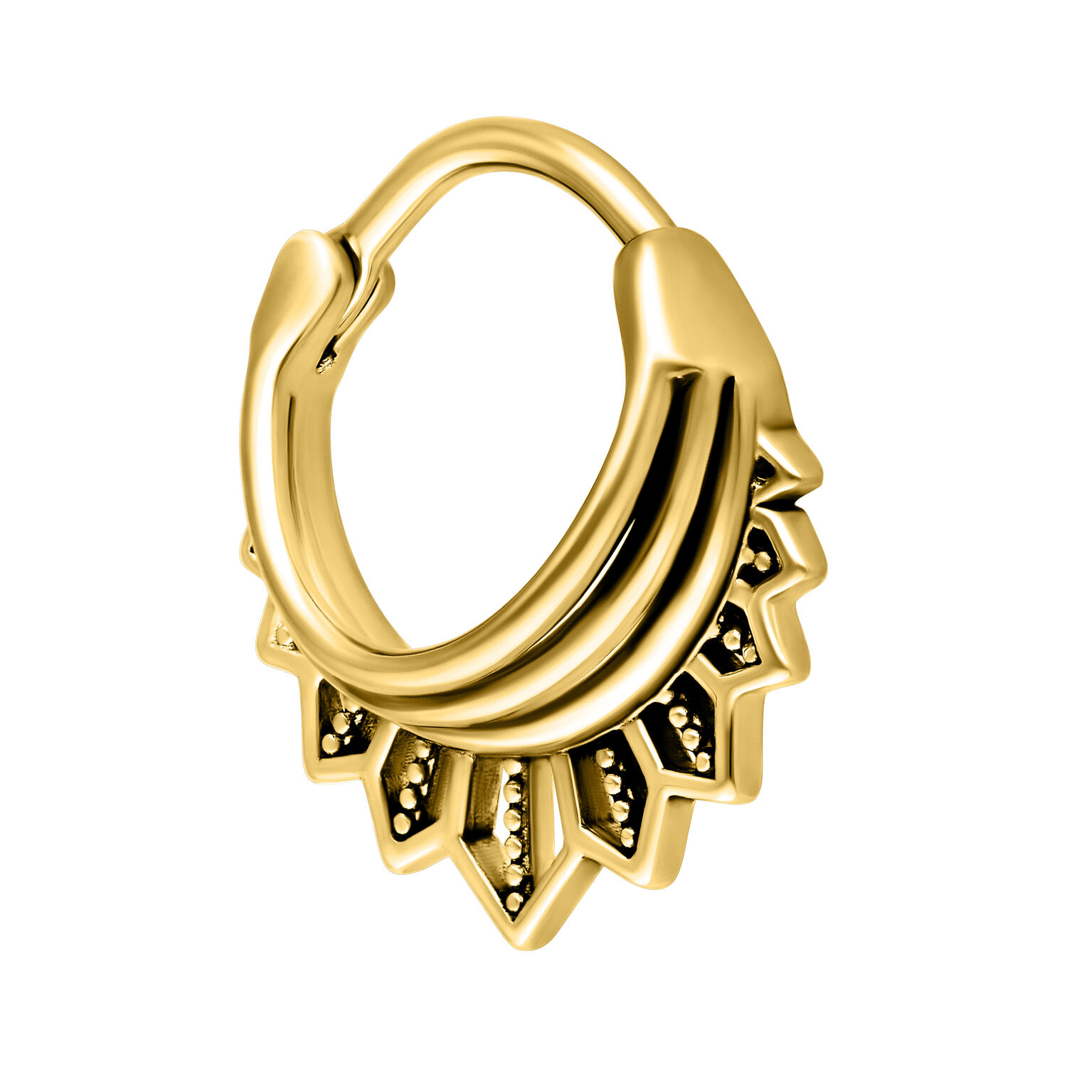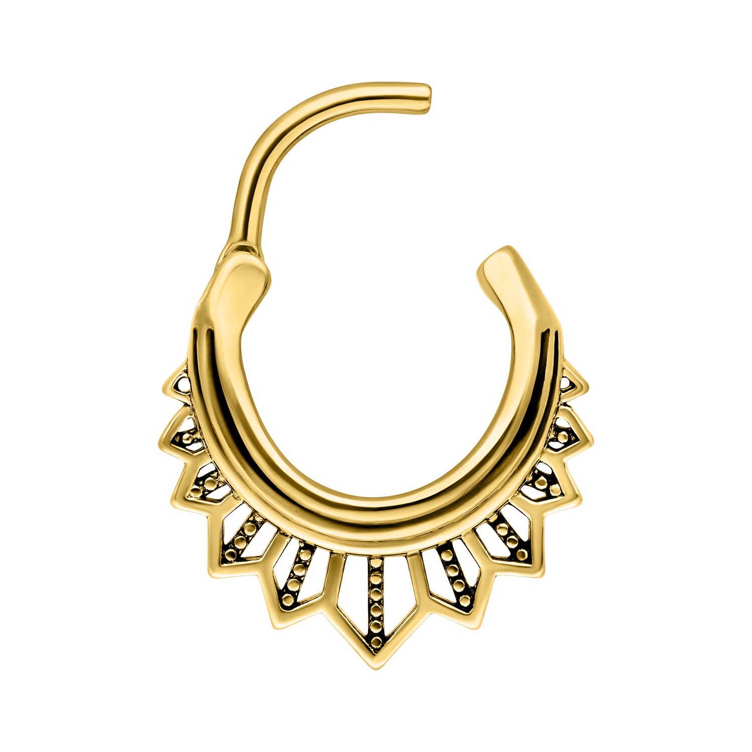 Unser Tigerlily Clicker ist aus hochwertigem Edelstahl hergestellt und ist ideal für dein Septum Piercing geeignet. Das Piercing besitzt einen gebogenen Scharnier, welcher dir eine einfache Handhabung beim Einsetzen des Piercings ermöglicht. Hast du einen starken Charakter und liebst indianische Designs? Dann ist dieser Nasenring genau passend für dich!