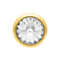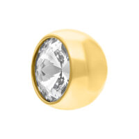 Titan Zirconline® -malliston kristallikoristeinen sisäkierteinen pallo sopii mihin tahansa 1,6 mm ulkokierteeseen. 8,0 mm kokoinen kullanvärinen koristepallo ja sen kyljessä oleva kristallikoriste saavat valon taittumaan ja kimaltelemaan upeasti.