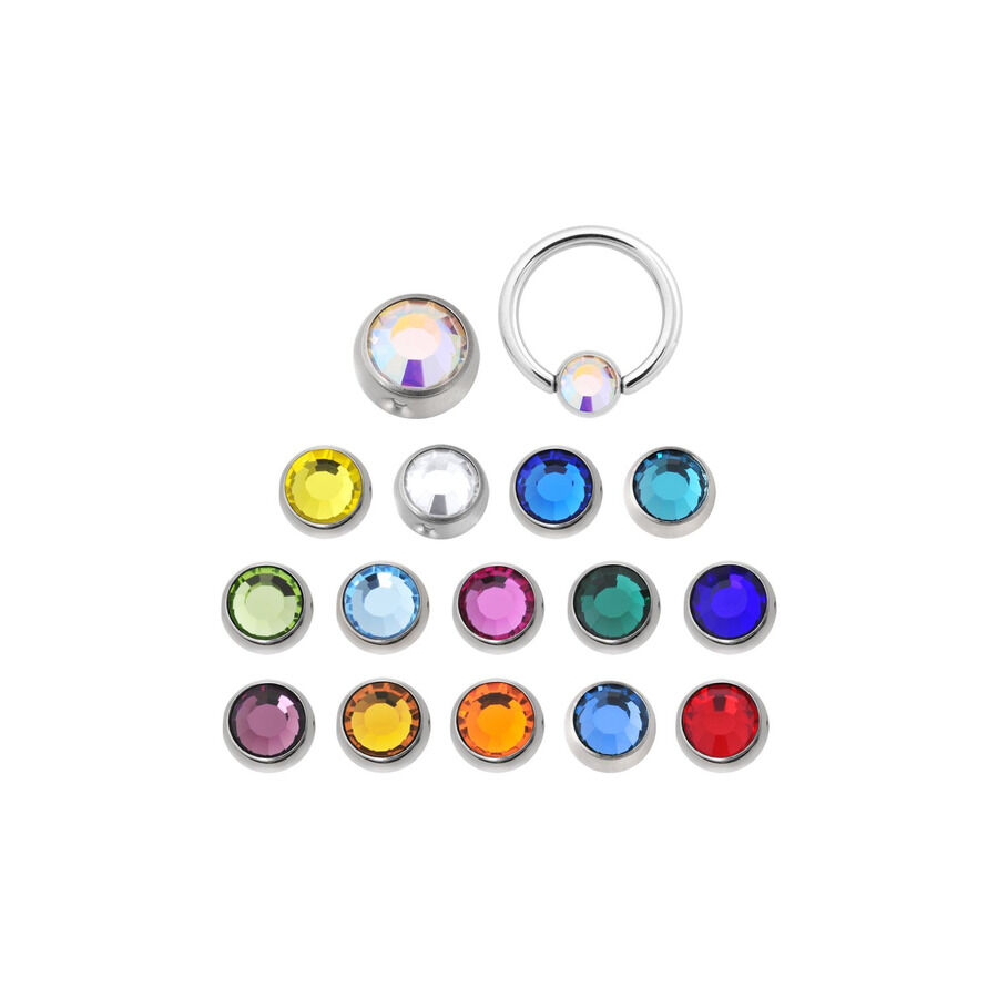 Der Jewelled Clip In Ball wird mit Hilfe einer Klemmkugelzange zwischen den Ball Closure Ring geklemmt. Achte bei der Wahl der Kugel darauf, dass sie genau zwischen die Enden des Ringes passen muss. Die Steine auf den Clip In Ballsl gibt es in einer immensen Farbvielfalt! Wähle deinen Favoriten!
