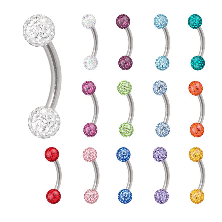 The Titanium Highline® Multi Jewelled Micro Bananabells with 1.2 mm rod thickness are available in lengths from 5.0 to 12.0 mm (in steps of one). The balls of the bananabells are set with precious crystals and sealed. The slightly curved rod is externally threaded. The balls can be screwed onto the external threads of our externally threaded bananabells. The balls are available with either 3.0 or 4.0 mm diameter.
